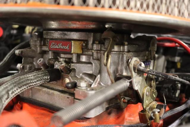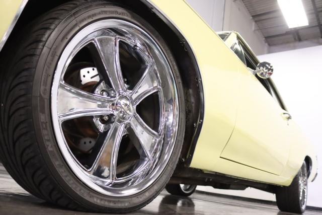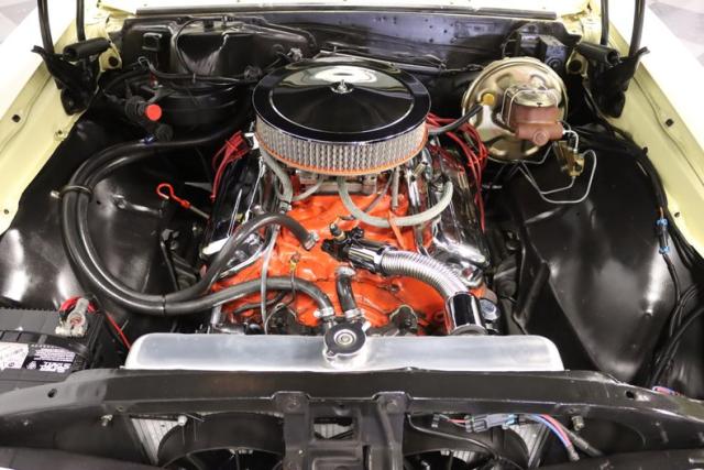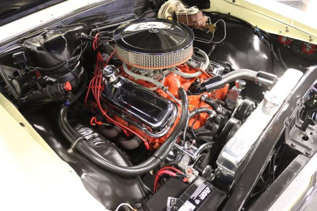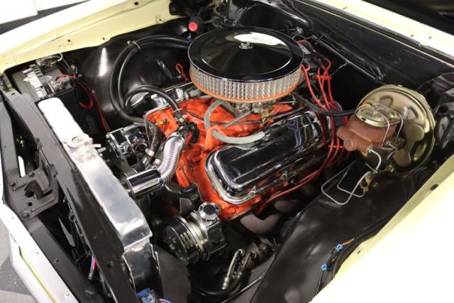 Filling the engine bay is big block Chevy power. You\'ll love how the bold block, bright valve covers, and matching air topper look like they are radiating power from within the dark engine bay. In fact, the callouts are doing a bit of fibbing, because you actually have a LARGER 454 cubic-inch V8. It inhales deeply with an Edelbrock four-barrel carburetor, and it exhales with power and authority with long tube headers. It\'s even supported by the right pieces, like a serpentine belt kit, an electric fan, and a newer aluminum radiator. The big block fires up eagerly, and its rumble of the dual exhaust makes this sound like a mild cam motor. This is a solid driver that you get to experience better thanks to the upgrade to a 700R4 four-speed automatic transmission with highway-friendly overdrive. As you look all over this coupe, you\'ll spot even more great driving features, like upgraded rear arms, power steering, power brakes, drilled & slotted front discs, and the grip of modern sport tires.