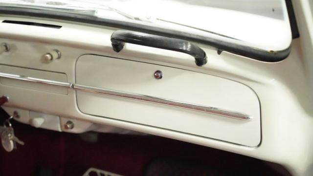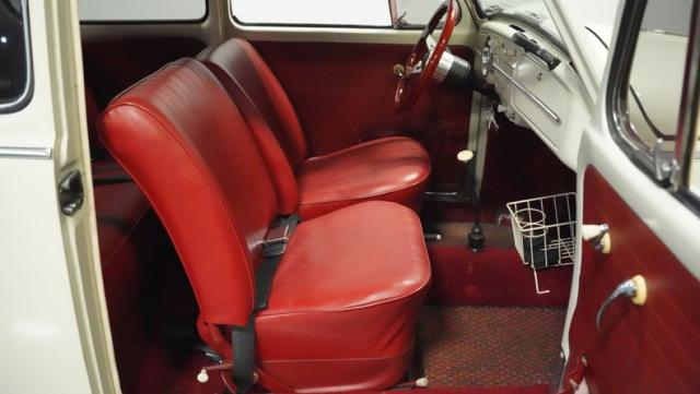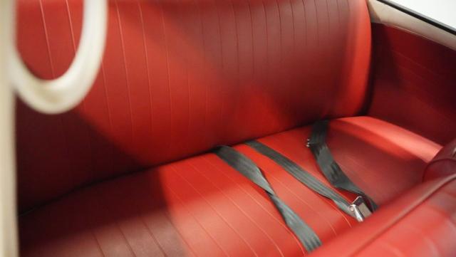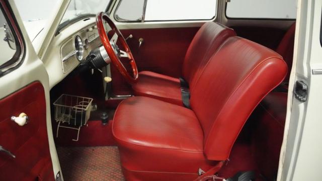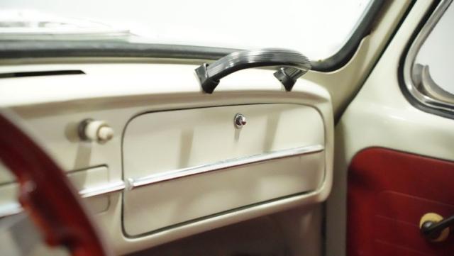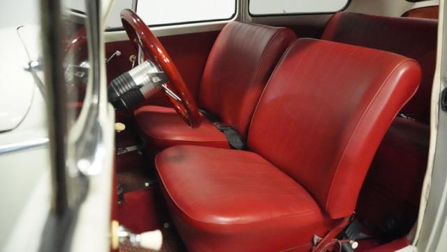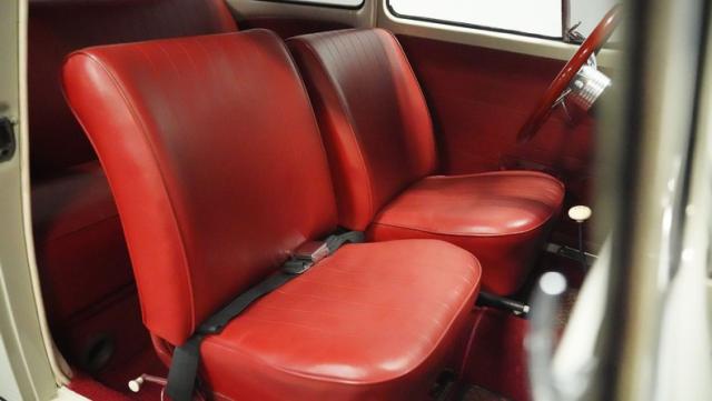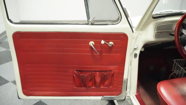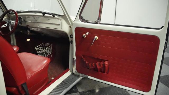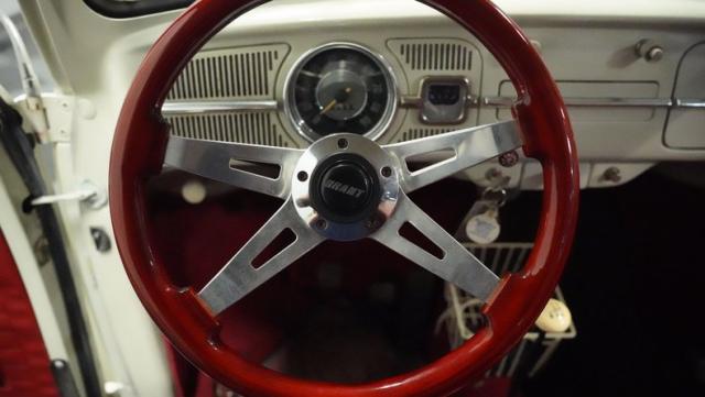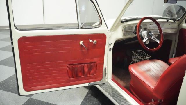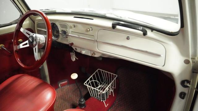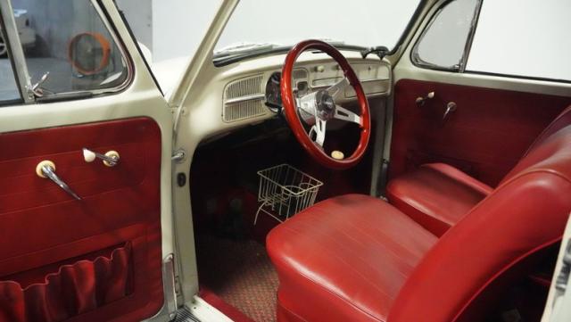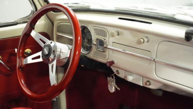 Inside, burgundy vinyl envelops every surface in rich, retro magnificence. The sculpted bucket seats look straight out of a 1960s European fashion magazine, delivering both style and support. A clever custom storage basket, complete with cup holders, brings practical convenience without disrupting the vintage feel. The sporty aftermarket steering wheel adds racing flair to this Beetle\'s cockpit, paired perfectly with the classic floor-mounted shifter that\'s ready for action.