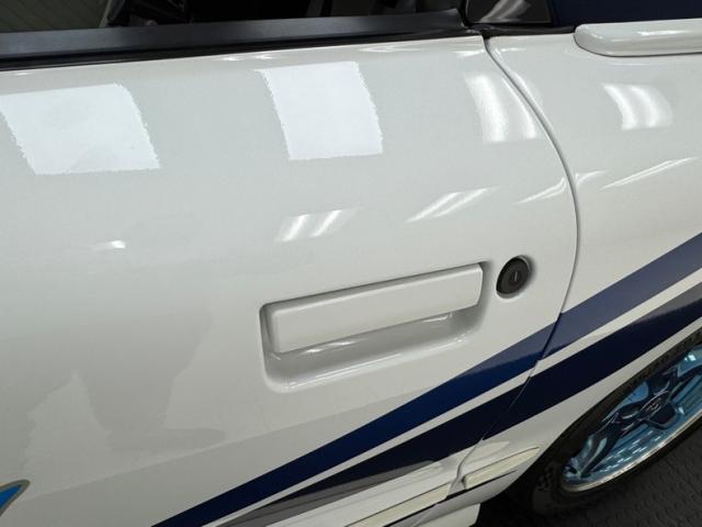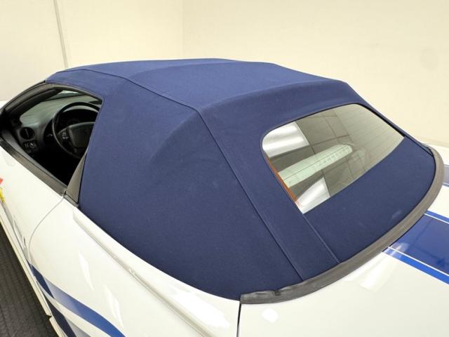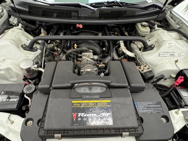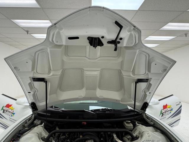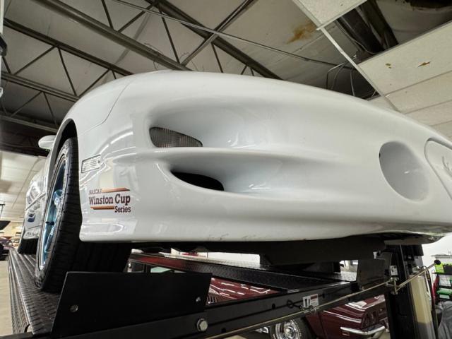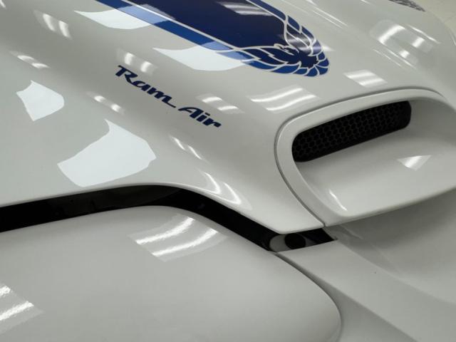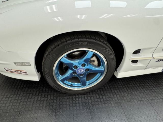 Like most of the Trans Am anniversary cars, the \'99 pays homage to its origins, the \'69 Trans Am, done up in Arctic White with blue striping. This one goes that extra step by including Daytona livery decals that include a colorful door piece and Official Pace Car on the rocker panels as well as more decorative decals on the front and rear aprons. But the Pontiac excitement doesn\'t stop there as anodized 17-inch blue wheels are added and reserved for the anniversary edition along with sweeping blue graphics over the rear quarter panel. The Ram Air hood and fascia of this generation is a favorite feature with aggressive nostrils, deep set fog lights, and marker lights that fit within aerodynamic coves. A windshield banner that can be read from the cheap seats clings to the glass and a dark blue canvas top caps this special edition. Imperfections include some edge chips, curb rash, clear coat deglazing on the rim of the wheels, side body molding that is discolored, and chin scrapes.