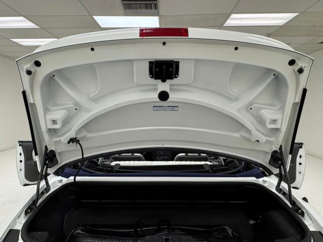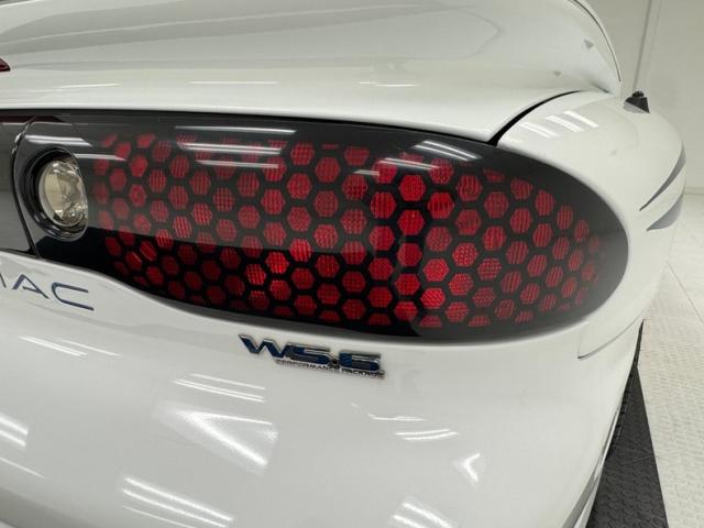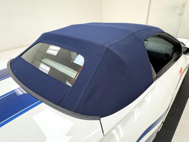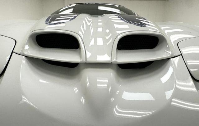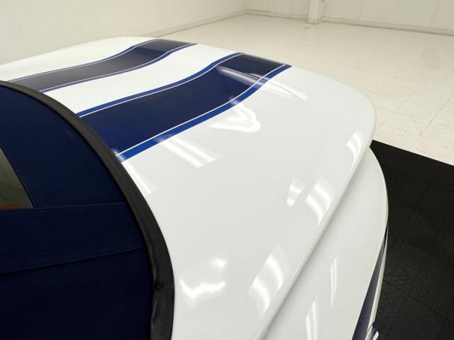 White inserts within charcoal framing on the door panels continues to keep the dramatic vibes of this car going and both doors present with clean materials, with a single scratch on the header of the passenger door. White leather bucket seats occupy the front with Anniversary embroidered headrests and while the driver\'s seat shows some minor creasing, the rest, including the deep 2+2\'s in back, are in great shape with a small stain on a rear upper noted. Up front, an airbag filled steering wheel fronts a simple instrument cluster with all the essential information and smooth materials frame the center stack where the gray buttoned Monsoon AM/FM/CD player and A/C panel reside. A T-handle shifter is in the center console along with a coveted and numbered 30th anniversary badge, (0174). Gray carpet floods the floor and gray panels finish the trunk, all in clean condition.
