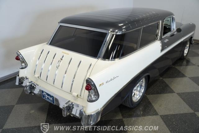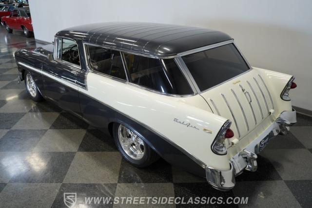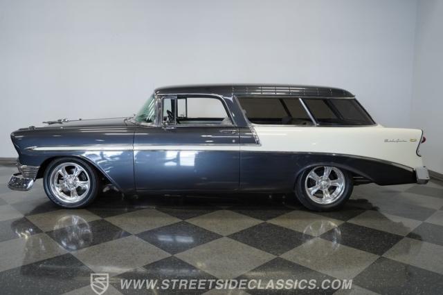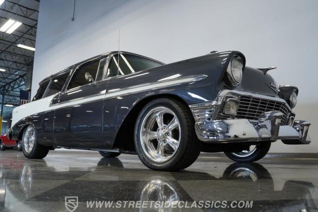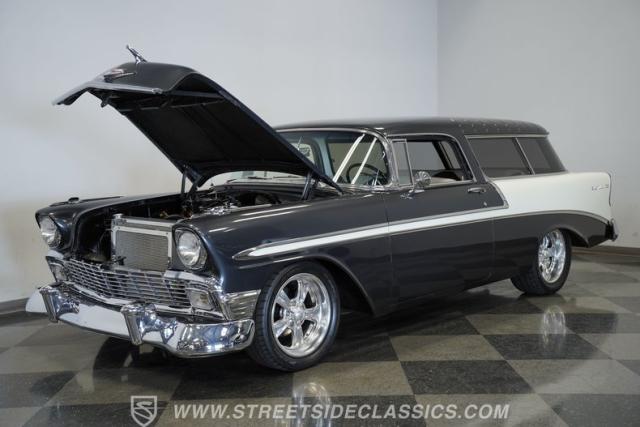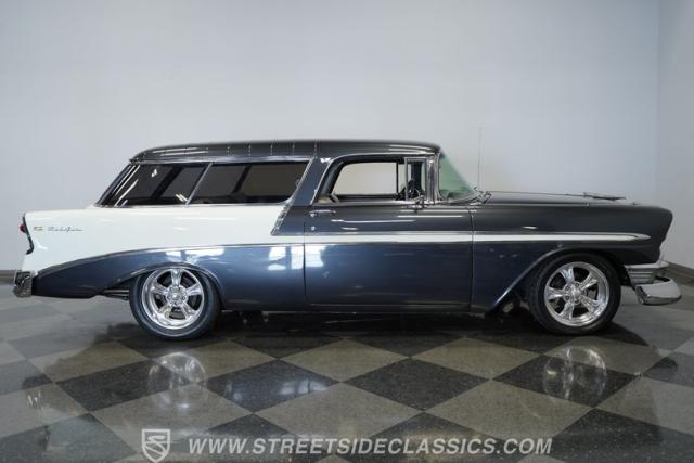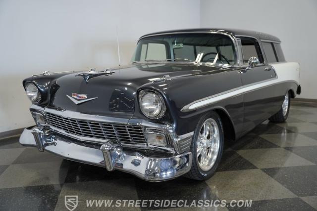 It\'s arguably one of the most iconic rides Chevy ever created. Just one look at this 1956 Chevrolet Nomad is all it takes to conjure up images of a simpler time, full of carefree adventuring. Revitalized in a Charcoal Gray Metallic over Cream color scheme, with some added metallic flakes in the gray section to catch the sun to perfection, this is a great looking classic. It features a tastefully lowered stance and its set of ultra-sharp 17\" Billet Specialties wheels adds the perfect finishing touch. This vintage Chevy\'s chrome bright work is in fine condition, including the telescoping chrome antenna, the window tinting retains nice, even coloring and a closer inspection will confirm that its door seals and window trim are pliable and have kept any potentially intruding elements at bay.