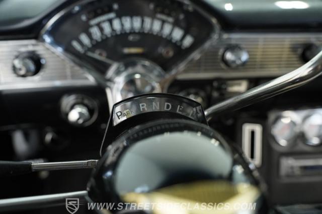 The vinyl interior has been thoroughly refreshed to color-match the exterior and it really presents well, with comfortable bench seating that shows no concerning wear and both carpeting and door panels that are in great shape. An undersized aftermarket steering wheel sits on a tilting column and the signature fan-shaped instrument cluster just beyond it is crystal clear, with a trio of AutoMeter gauges integrated into the custom center console just to the right to monitor motoring functions, along with a Pioneer AM/FM/CD stereo. An added Vintage Air climate control system makes this Bel Air a comfortable driver throughout the year and while the system isn\'t currently blowing as cold as it should, that should likely be remedied by a simple freon recharge.