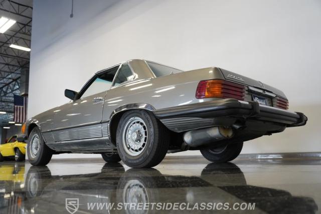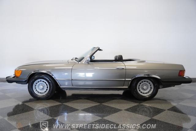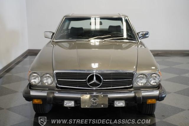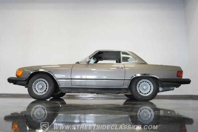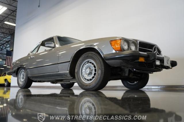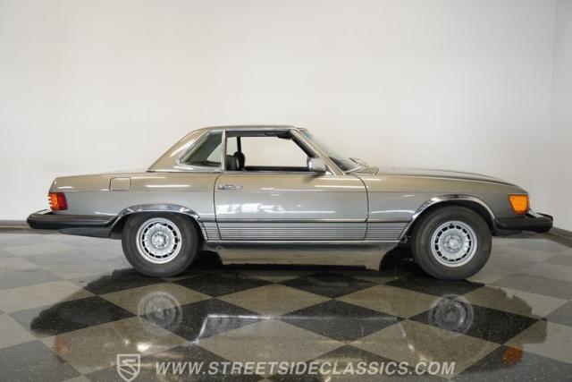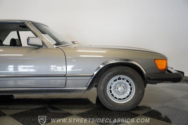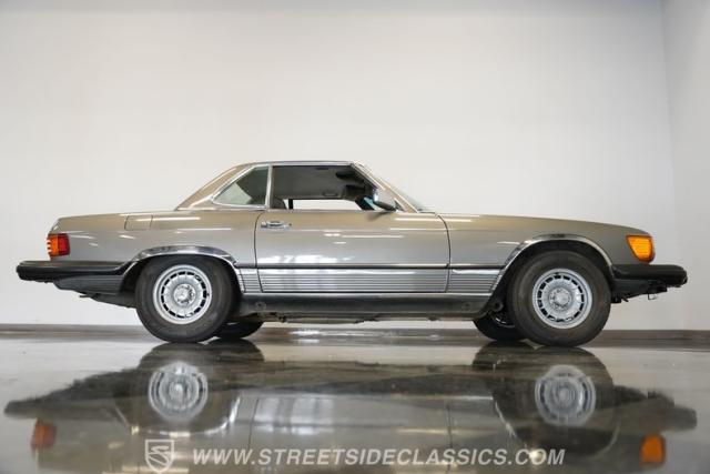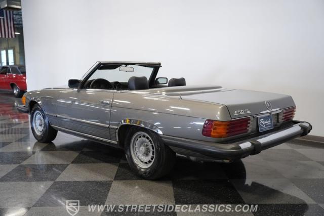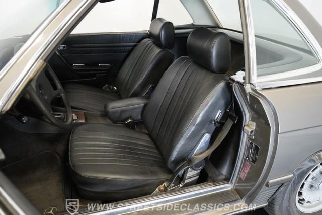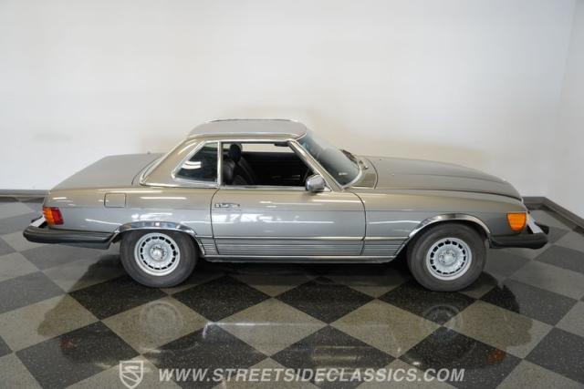 A classic luxury roadster from Stuttgart, this highly original 1980 Mercedes-Benz 450SL displays a vibrant Anthracite Grey Metallic finish that complements its well-proportioned form. This R107 design allows for dual personalities with its removable metal hardtop and manual convertible soft top, giving you options for any weather condition. This exterior maintains clean, flowing lines that have made it a favorite among luxury car buyers. Mounted on 14-inch wheels with 215/70R14 tires showing good tread depth, this 450SL has a planted, solid look on the road.