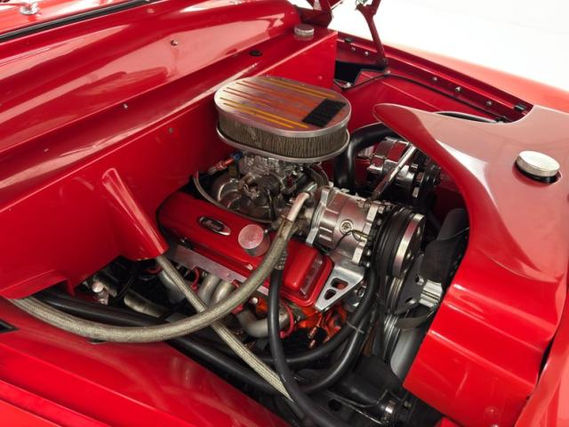 Red valve covers top this showy engine, a 350ci V8 with a 4-barrel carburetor over an Edelbrock intake and headers. It\'s mated to a TH350 3-speed automatic transmission which routes power to the Dana 44 axle in back. The bay is dressed in glossy red panels and inner fender wells and is ready for all \'hood up\' shows!