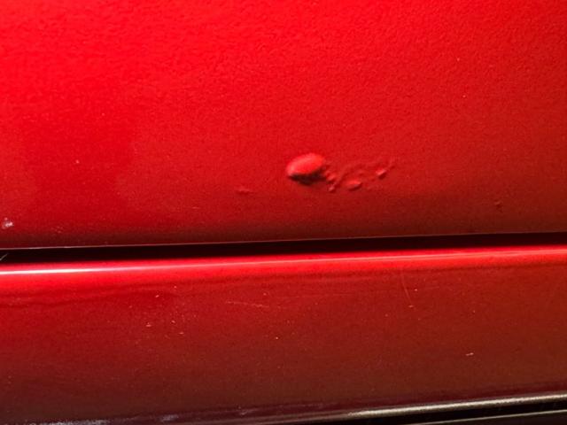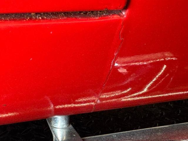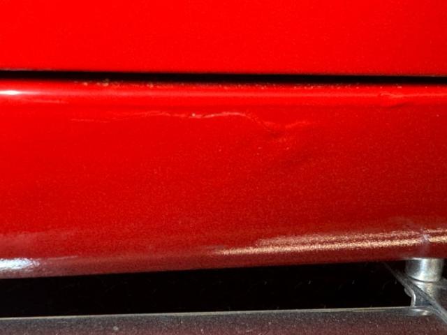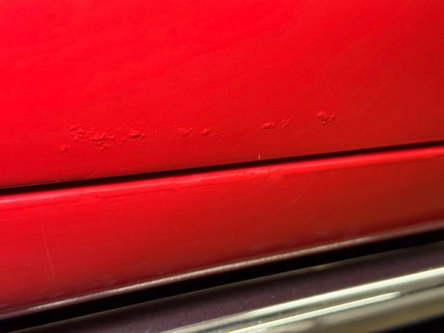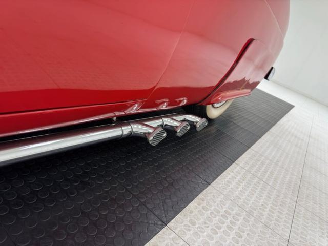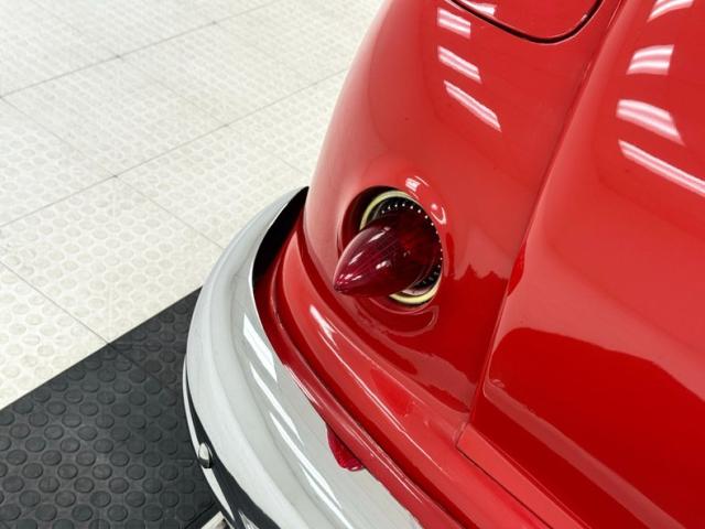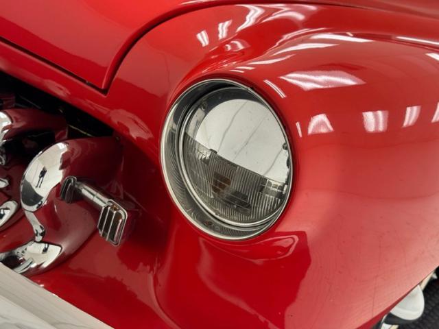 Your Radio Flyer was red, and this lead sled is too, clinging to the ground like a giant beetle in two stage Flame Red paint that is as eye-catching as a fire engine. Some skillful pinstripe flourishes show up on the red while chrome is the main source of contrast, and it\'s most obvious up front where the big grille would make a walrus jealous and the headlights wear a half chrome cover that makes them extra reflective. A nosed hood sends your eyes to the two part windshield surrounded by more polished metal in A-pillar spotlights and door post side mirrors. In profile, the wheel covers are ringed by a red rim and white walls frame it like a portrait and faux side pipes complete the street rod dcor, along with Cadillac tail lights. Imperfections include some bubbling and cracking on lower panels.