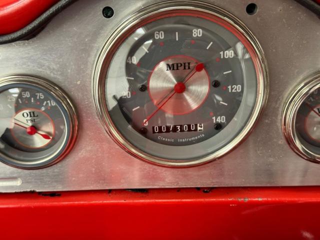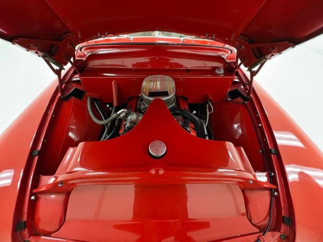 Forget what the brochure said about six big people, you\'re only getting four in here but they will be a very happy four in this spectacular cabin! It\'s all custom beginning with the white door panels with red piping, followed by the front buckets in the same pattern and looking clean. A custom center console cuts through the middle, splitting the rear seats with lipstick red paint and red seatbelts. Up front, this console houses the Vintage Air controller and vent, a stylish tachometer, and a Kenwood controller. We note two hairline cracks near the vent. A white steering wheel on a tilt column fronts glossy red dash with a billet faced instrument cluster and those gauges are gray faced units with red highlights and a Kenwood AM/FM/CD player is centrally located. Plush red carpet floods the floor, a white headliner with north to south stitching is up above, and the trunk combines both red and white for a cozy and clean finished storage area.