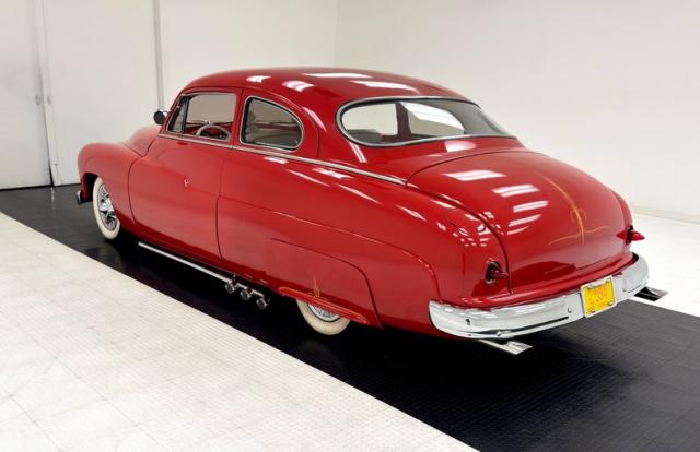 For consignment, a 1950 Mercury eight 2-door sedan showing 7.300 miles, but the true miles are unknown. Here\'s a street rod version with the big toothed grille, frenched headlights, and some sweet faux side exhaust!