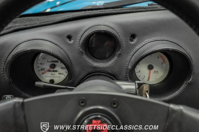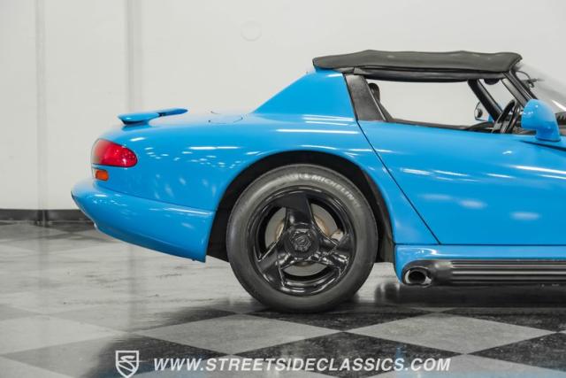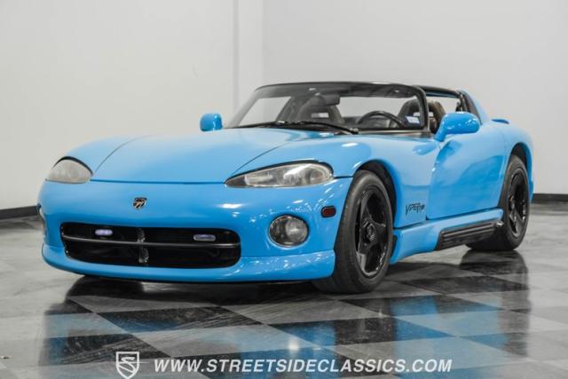This 1995 Dodge Viper RT-10 roars to life with only 51,004 original miles on the odometer. The exterior flaunts a striking blue vinyl wrap, giving this American muscle icon a modern edge. Black 17-inch wheels create a stark contrast against the vibrant body, amplifying its aggressive stance. The side-pipe shield, emblems, and wheels all sport a sleek black finish, adding to the car\'s formidable presence. A removable targa top with a black cloth roof and detachable side and rear glass offers the freedom to choose between open-air thrills or closed-cabin comfort. Michelin tires (275/40ZR17 front, 335/35ZR17 rear) provide the grip needed to tame this powerhouse.