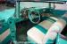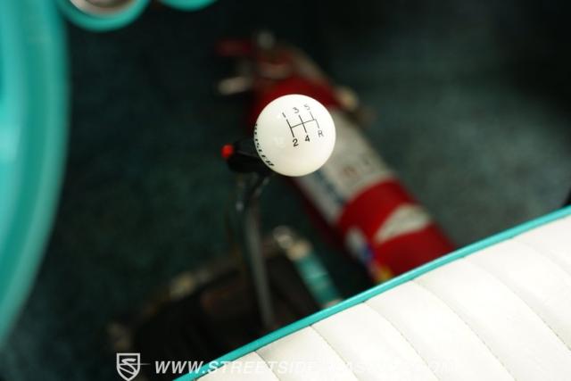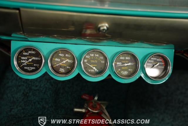 Inside, we find a custom teal and white vinyl interior complete with benched seating front and back and a matching two-spoke teal steering wheel that sports the Crossed Flags emblem in the center. Along with the OE-looking dashboard is a huge steering-column-mounted tach and five auxiliary gauges mounted beneath the glove compartment to provide all the vital information needed to ensure this beast runs smoothly.