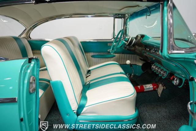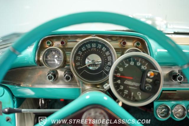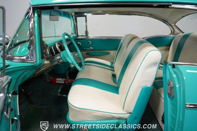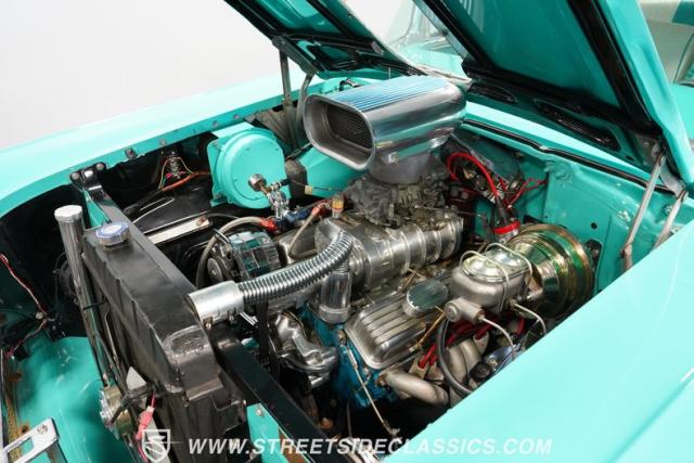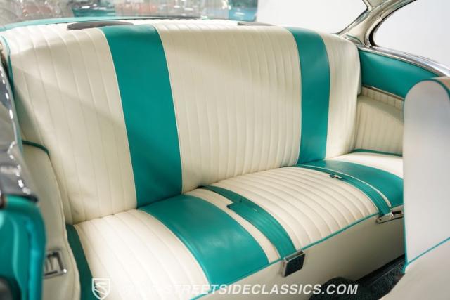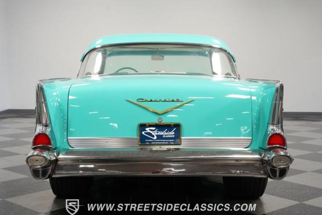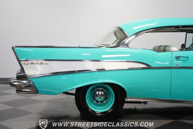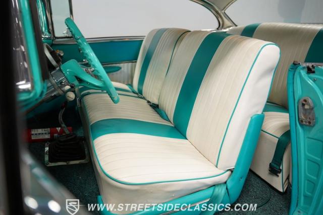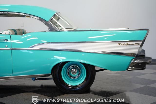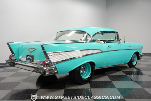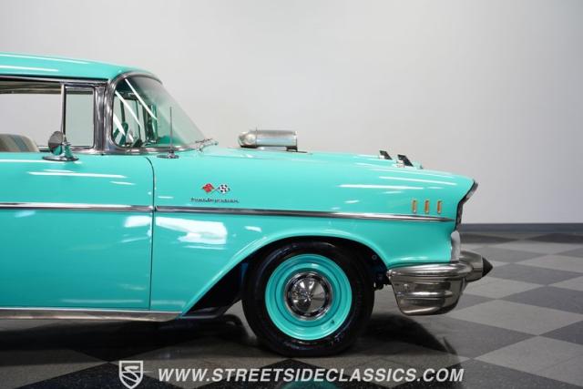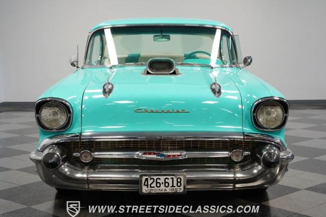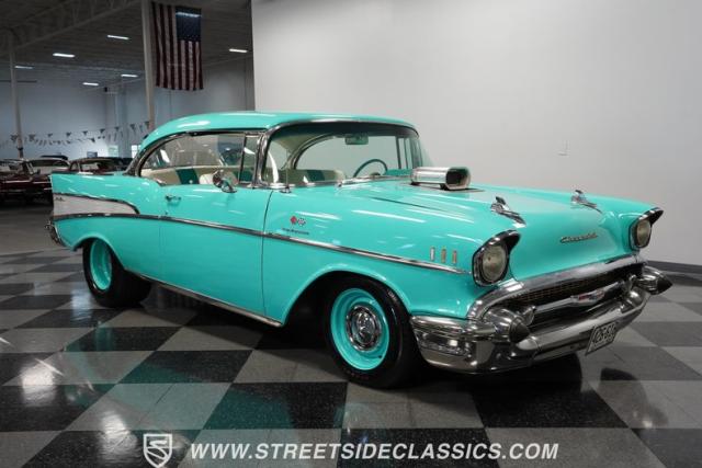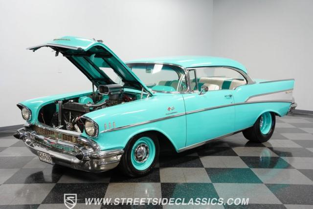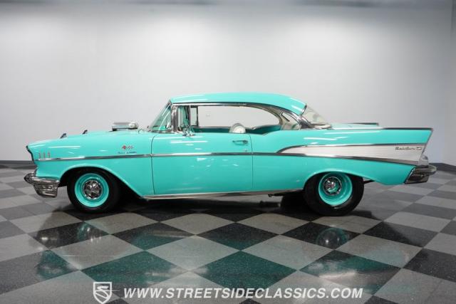 In the realm of the autoverse, few vehicles have starred in more enthusiasts\' fantasies than the iconic \'57 Chevy. Whether Concours show level or full restomod, there is nothing like it, and this gorgeous, fully repainted teal 1957 Chevrolet Bel Air Supercharged model we have for you is truly one of a kind. Starting with its highly sought-after two-door hardtop configuration, this head-turner is set up with skinny 165/80R-15 front tires contrasted with massive 29x12.50R-15LT meats out back in classic hot rod style. With coilovers, a tubular upper control arm up front, air shocks, and traction bars in the back, this \'57 is poised to be a true boulevard bruiser.