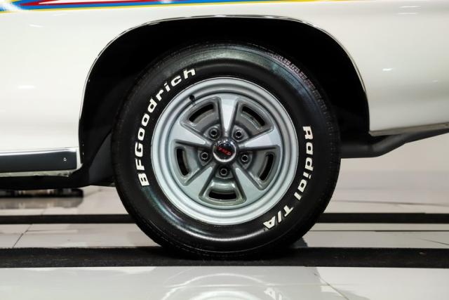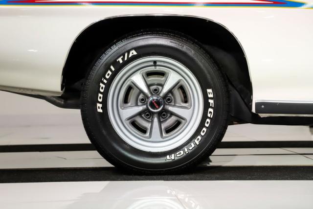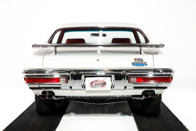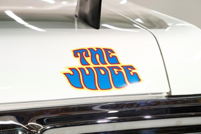 EXTERIOR: The Judge has a bold appearance you can\'t ignore with distinctive graphics and spoilers. This body is very clean, straight and fits right. The doors, trunk and hood click shut. The door and trunk lip are clean, and the bottom of the fenders are all metal. The rubber front bumper fits right too and only has one hairline crack. Repainted its original Polar white and it is polished to a smooth, gloss finish with just a few blemishes. The rear bumper was rechromed, moldings are good. The 15 inch Rally II wheels were restored and are wrapped in BFG tires.