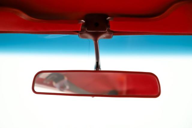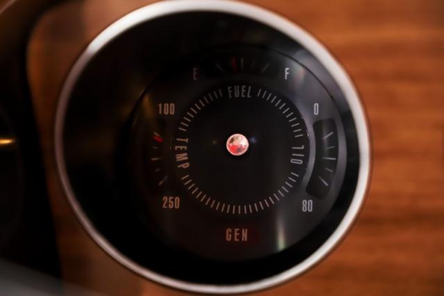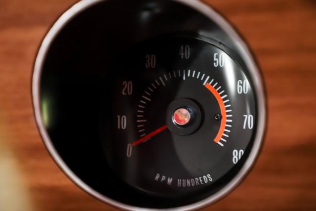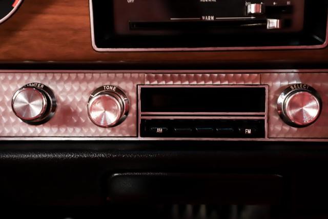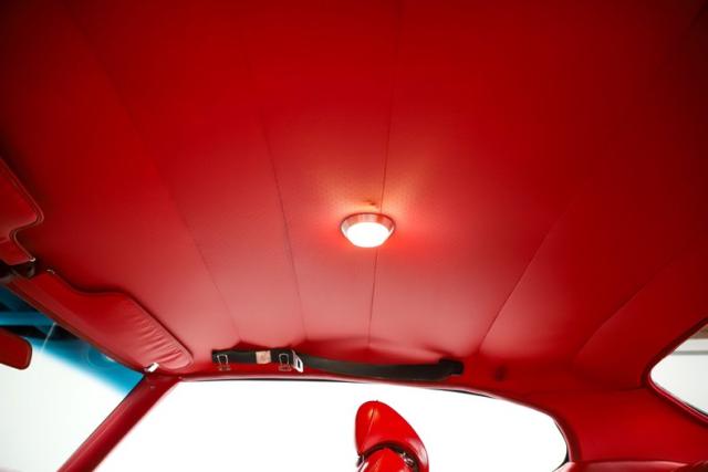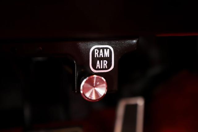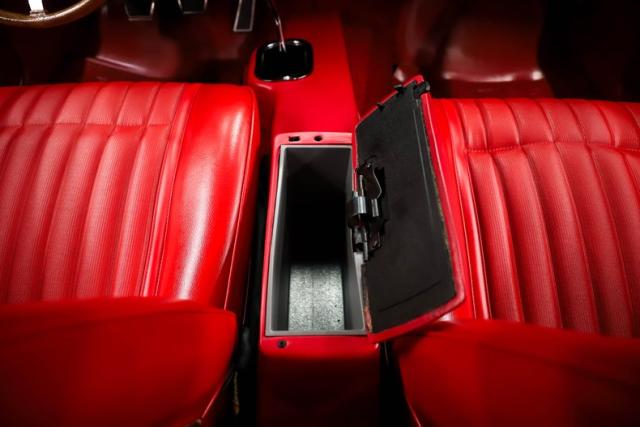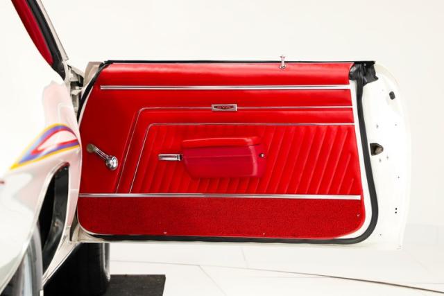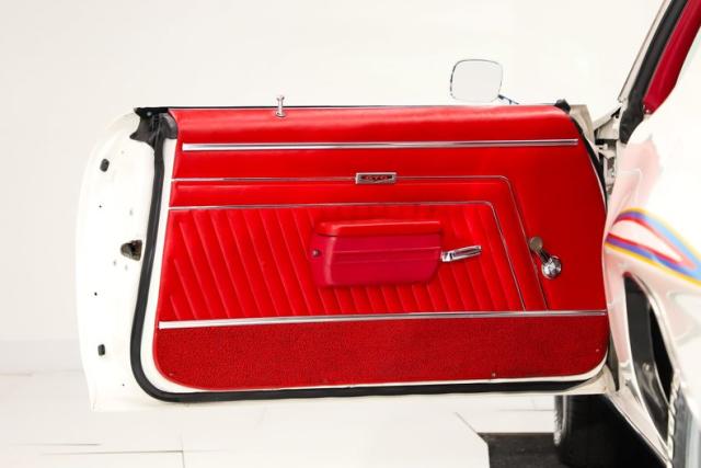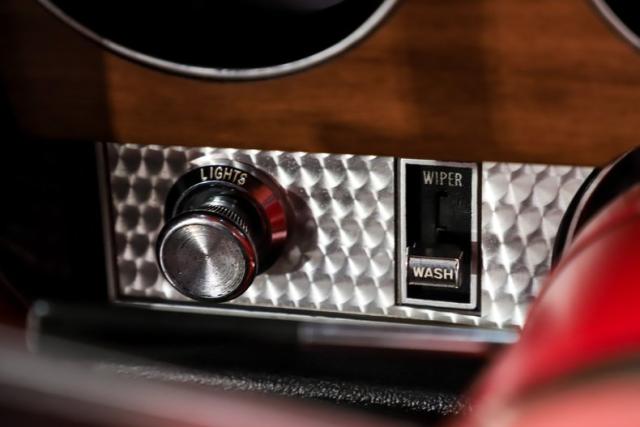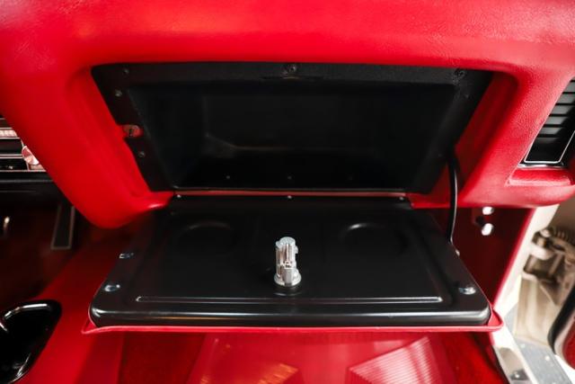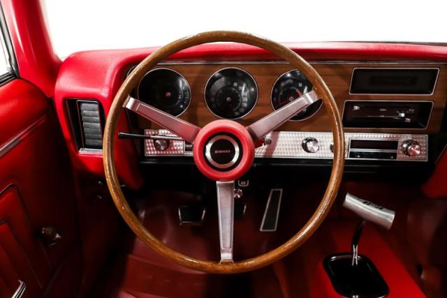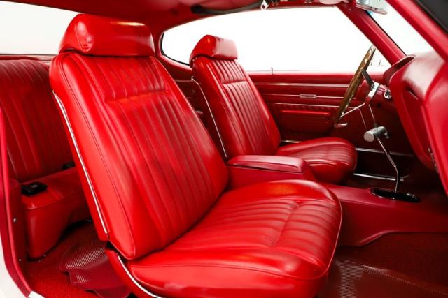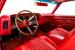 INTERIOR: The red pops! Inside this car is in outstanding condition, mostly replaced. Fresh red carpet and reproduction mats on the floor. The console looks new and has the correct T-handle on the Hurst shifter. The seats were recushioned and upholstered. Door panels and armrests were replaced. The dash pad looks new, the instrument panel is excellent and it features factory gauges and tachometer. The radio is upgraded with a retro stereo with 6x9s in back. A new deluxe wheel is on a tilt column. The headliner and visors were replaced.
