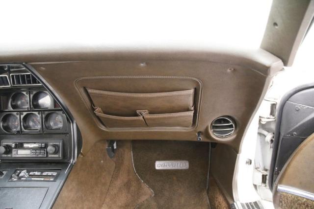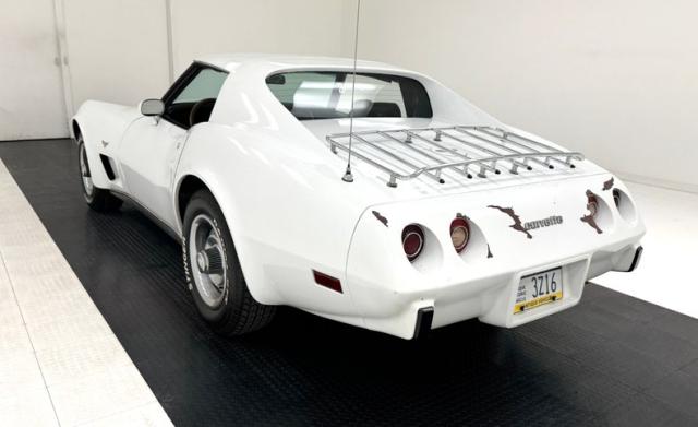 Bathed in Chevrolet Classic White, the paint is looking a bit aged in places with some cracking and crazing, as well as chip offs especially on the neoprene bumpers. Coves just behind the front wheels flare into the fender nicely and move upward to form the curved fender that melts into the hood area, which also houses the hidden headlights. A coke bottle design really showing on the rockers with a thin accenting black stripe. On top, the \"T\" style roof with removable panels is an option on this car. Those flying buttresses panels are seen angling toward the rear deck where a chromed luggage rack is perched. A wonderfully rounded rear roll pan all in neoprene houses round tail lights. Some serious paint chip off is noted on this rear bumper. 15-inch Chevrolet rally wheels are all around and wrapped in raised white letter Stinger Radial GTS, 215/70R15\'s all around.