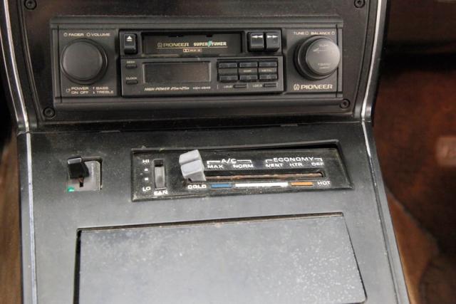 Peering through the removable \"t\" top we see original dark brown leather covering the sleek thin high back buckets which are in nice condition. These are fronted by an angled dash that has a center console extension which houses several gauges, (5 to be exact), in the center just above the shift lever. An AM/FM/Cassette player is inserted here as well. Deeply embedded circular gauges are in front of the driver and the original brown leather covered steering wheel. The dash is also brown and is seen in good condition with no cracks or fading. Brown carpet covers the floors and is in generally good condition On the passengers side, no glovebox, but dual storage pouches are conveniently located in the dash. Some options include factory air conditioning, power steering, power brakes and power windows. As we exit sleek door panels in brown leather and molded vinyl with some black accenting and chrome framing swing behind us buttoning up the interior.