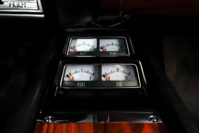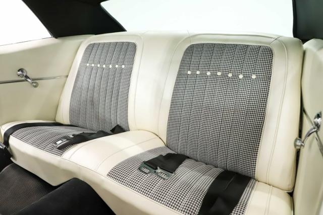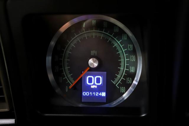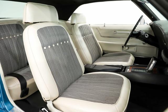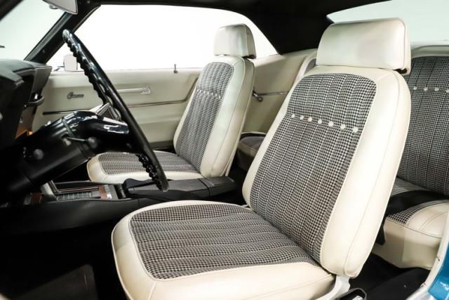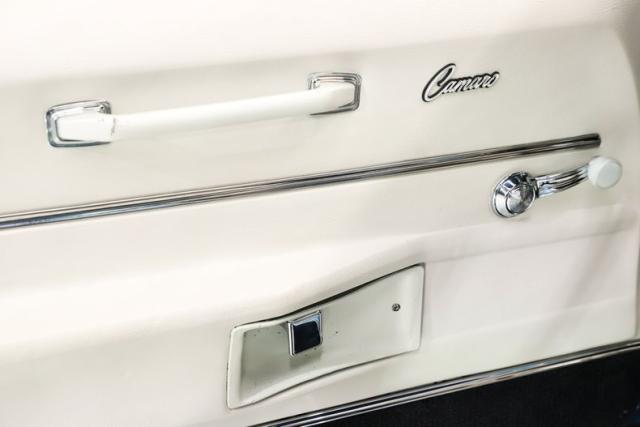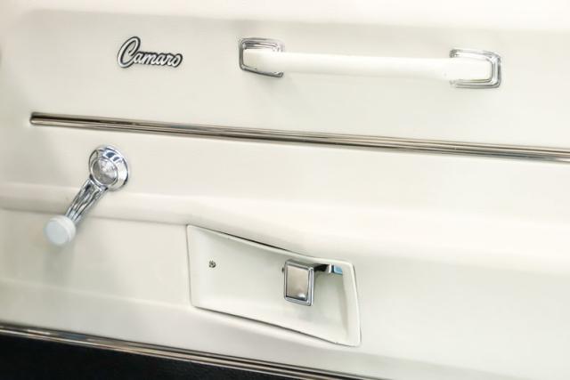INTERIOR: This white houndstooth deluxe interior adds serious sizzle to an already hot Camaro and it\'s brand new. The deluxe molded door panels, fresh seat cushions, upholstery, and newly installed headrests give the cabin a crisp, upscale look. Fresh carpet lines the floor, while a tight fitting headliner with matching visors completes the clean appearance overhead. In the dash is a very cool set of retro style gauges, currently showing just 1,125 miles. The factory console has been updated with an overdrive automatic shift indicator, blending classic style with modern function. A retro stereo fits neatly in the factory location and sends tunes through 6x9 rear speakers along with speakers mounted in the kick panels. The reproduction SS steering wheel is mounted on a tilt column, and a full set of factory seatbelts is in place. Fresh, stylish, and exceptionally inviting, this is one attractive interior.