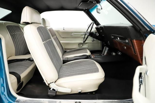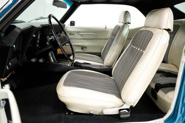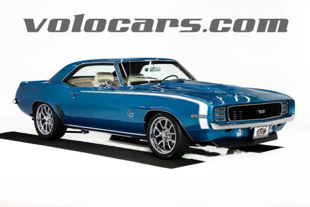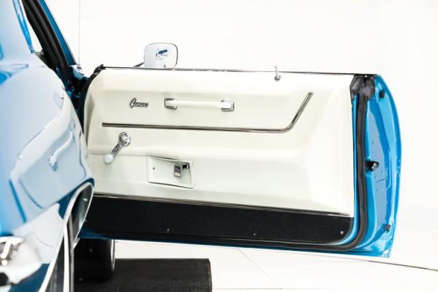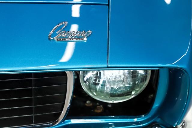 EXTERIOR: Undeniably stunning, this \'69 Camaro is the kind of car that turns heads everywhere it goes. The iconic body style is legendary on its own, and this one takes it even further with a cowl hood, front and rear spoilers, and its original Le Mans Blue finish without a vinyl top. The body is absolutely straight with beautiful panel fit, while the metallic paint is laid out evenly and topped with a smooth, glossy clear coat that shines from every angle. White hockey stick stripes add even more sizzle. It\'s also dressed with the desirable exterior trim group, including wheel well moldings, quarter panel louvers, and rain gutter trim. Then there\'s the Rally Sport package, featuring hideaway headlights upgraded with electric motors for modern convenience. The chrome trim, glass, and weatherstrips are all in excellent shape. Finishing it off is a proud stance on chrome Resto Laguna wheels wrapped in performance tires, 17 inch in front and 18s in back. This Camaro has the looks, presence, and attitude to back up its performance.