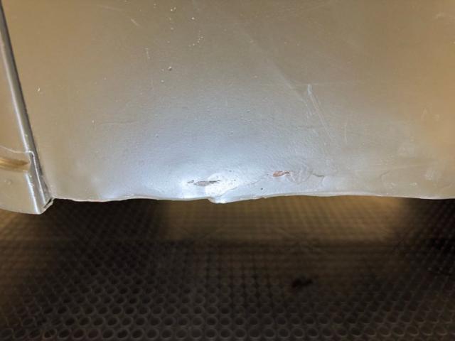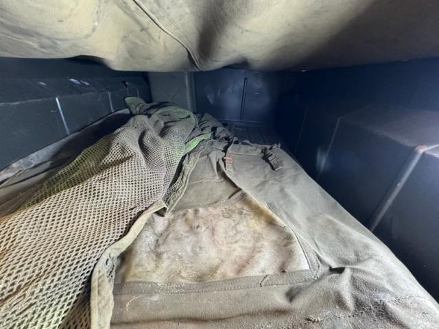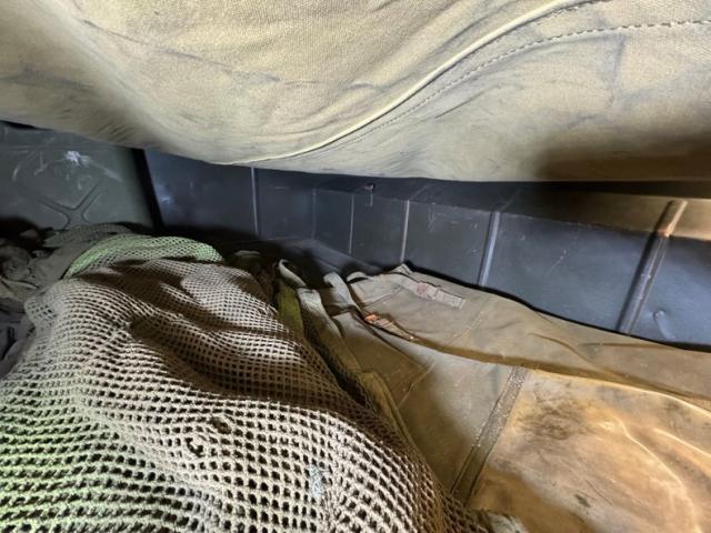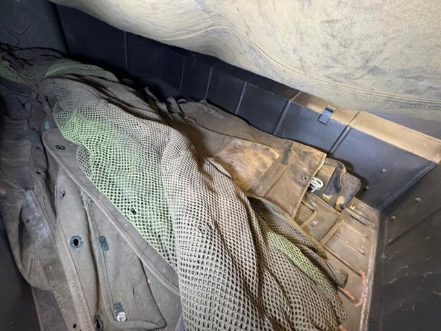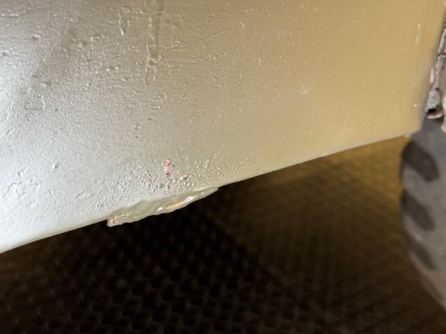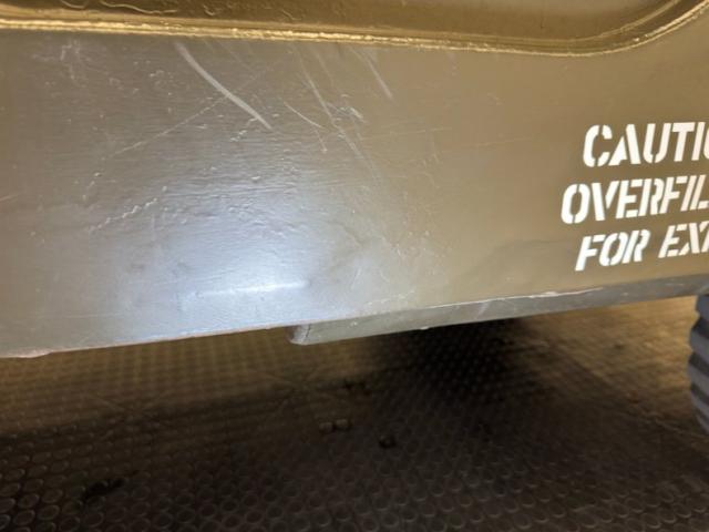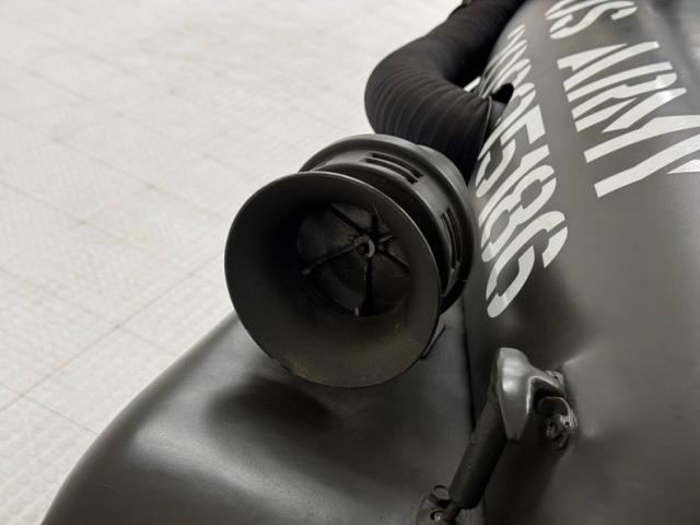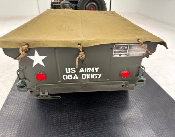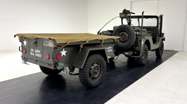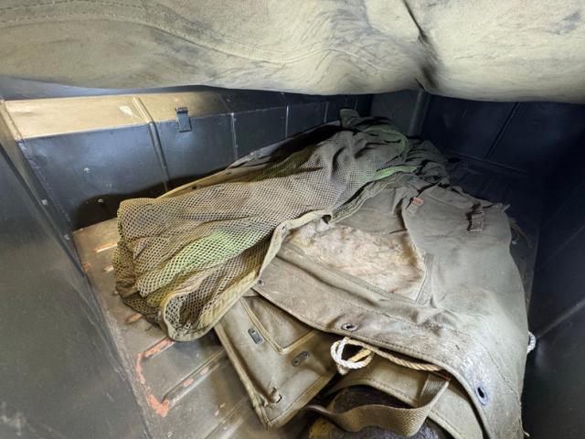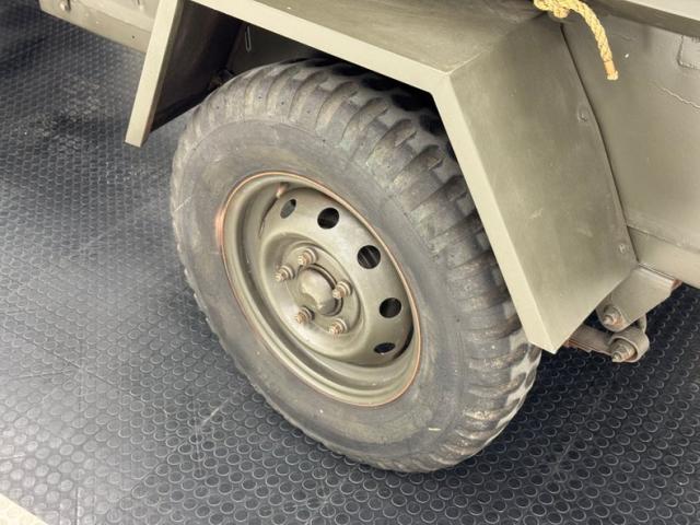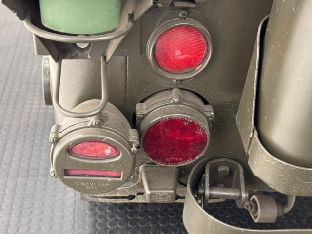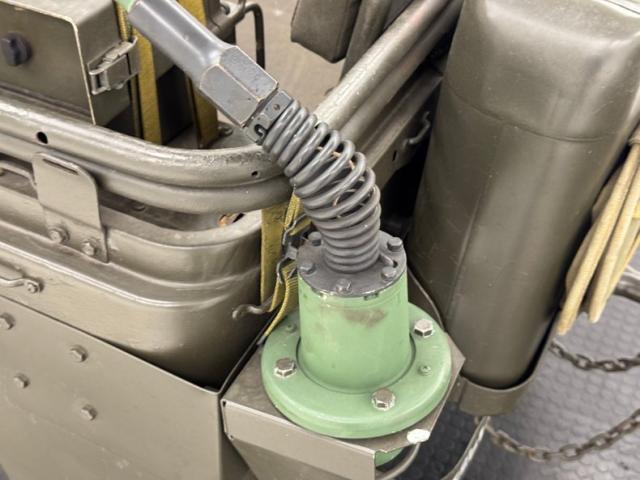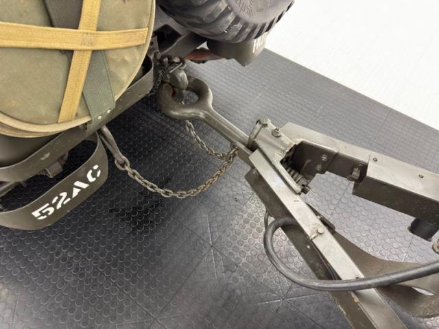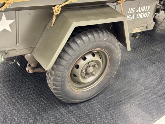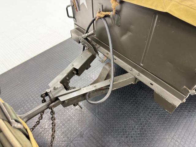 Typical military Olive Drab covers the 4x4 and trailer and is adorned with contrasting white stenciled writing and Army stars, and the 16-inch steel wheels share in the olive coverage. Up front, the utilitarian bumper is topped with a pair of tow shackles under the seven slot grille and siren on one fender and night light on another and everything from the hinges to the hardware share one color. A pintle style hitch hooks the to the trailer and safety chains, olive green of course, secure it in place and a Jerry can is mounted to the back of the Jeep. Exterior features include a whip antenna secured to the cowl, a snorkel air intake that rises with the windshield, and of course, the machine gun which is equipped with propane to create harmless, flared popping. The flat trailer has a rugged canvas top secured to the unit with rope. Overall, the truck and trailer are in good shape with no major dents. Imperfections include some bubbling, cracked paint, uneven filler, and paint runs.