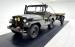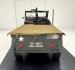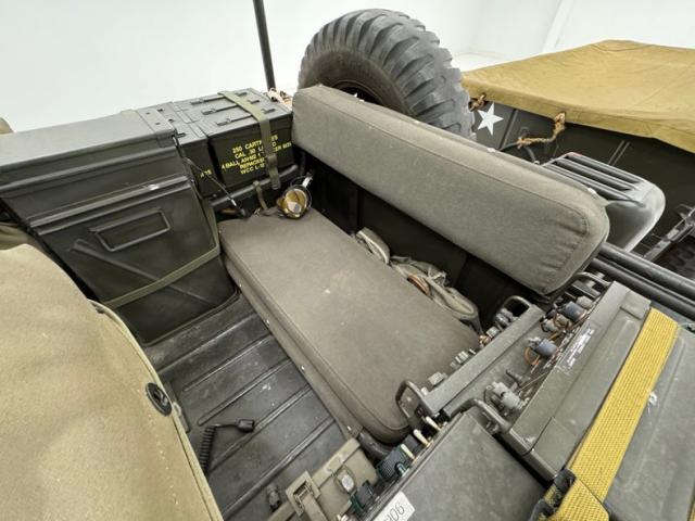 The doorless Jeep features olive green padded seats with the driver\'s riding above the gas tank. In back, a straight bench can seat a couple more infantrymen who can keep tabs on the radio equipment and the six secured ammo boxes that reside nearby. There\'s a first aid kit, some vintage headphones, and canvas storage attached to the front seat backs. Attached to the post of the belt fed .30 caliber machine gun is a plastic rifle, completing the profile as a rolling, ground fighting tool. The basic steering wheel is joined by toggle switches and a center instrument cluster and three, floor mounted shifters for gears and range type. The floor is painted but not covered with anything and the trailer is equally as bare bones, housing a number of canvas pieces.