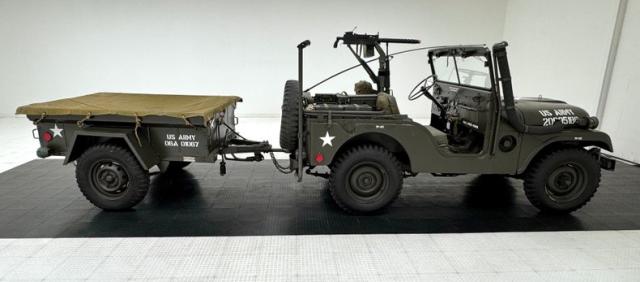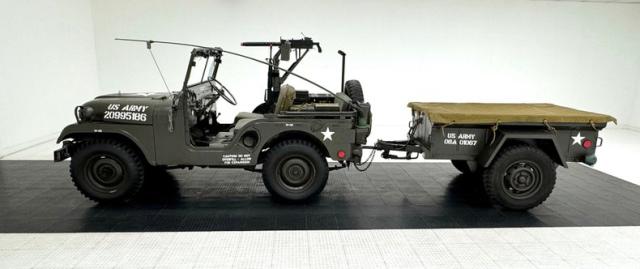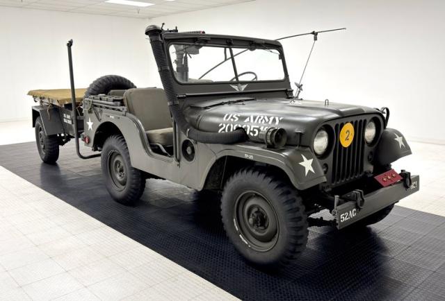 For consignment, a 1952 Jeep Willys CJ3A showing 94,969 miles, but the true miles are unknown. This one dressed as it might have been for the Korean war, or an episode of MASH, right down to the mounted rifle and the trailer.