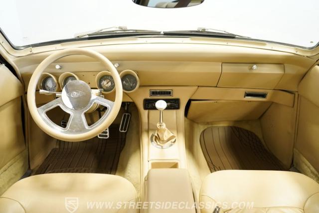 Inside, you will find a beautifully crafted custom interior designed for both comfort and flair. The front bucket seats and rear bench are wrapped in matching vinyl, complemented by a vinyl headliner and stylish door panels. Modern upgrades like power windows, a Sony aftermarket radio with Bluetooth and aux input, and an aftermarket steering wheel add convenience and fun. The center console features a floor-mounted shifter and emergency brake, while the dash and gauges are in great condition. Speakers are thoughtfully placed throughout, providing an immersive audio experience as you cruise.