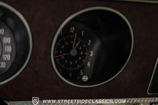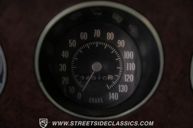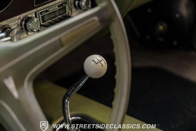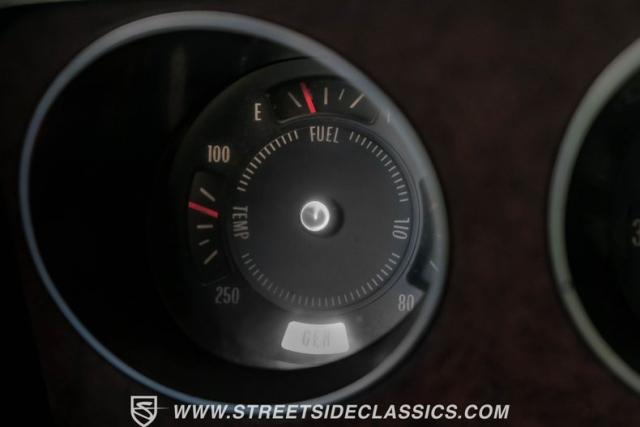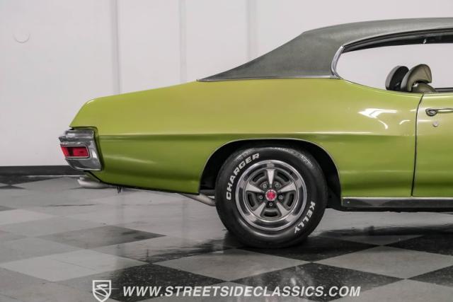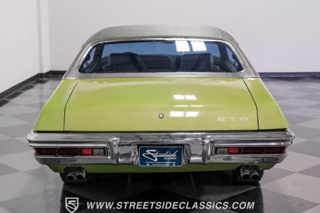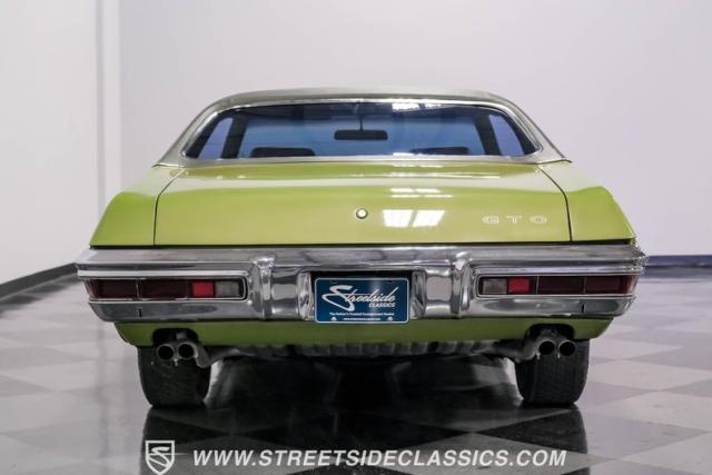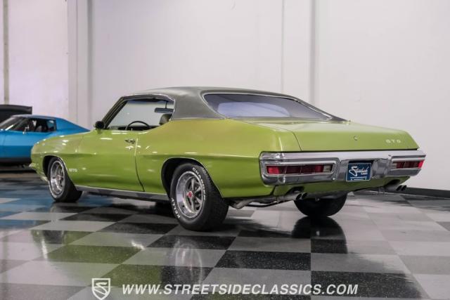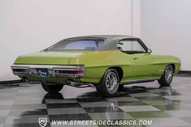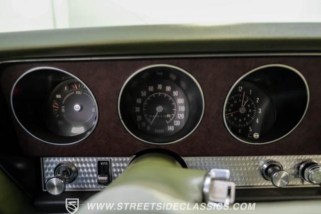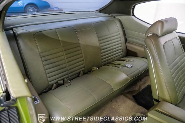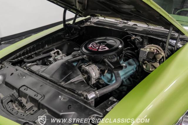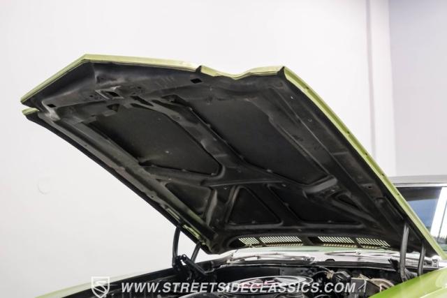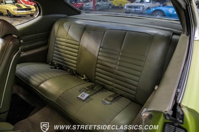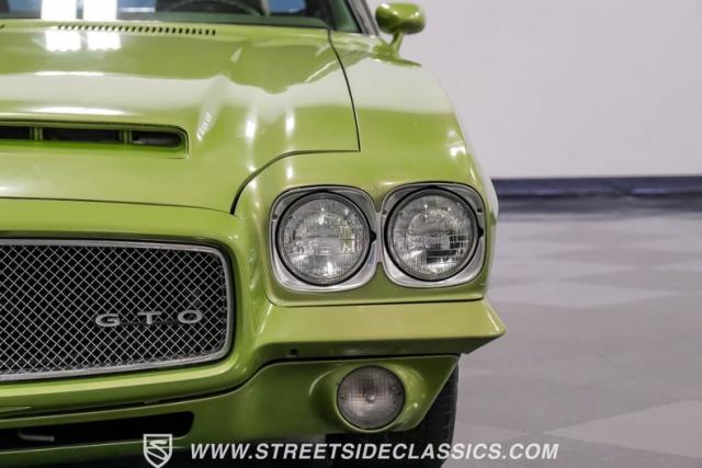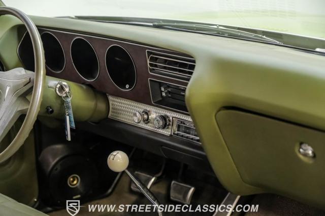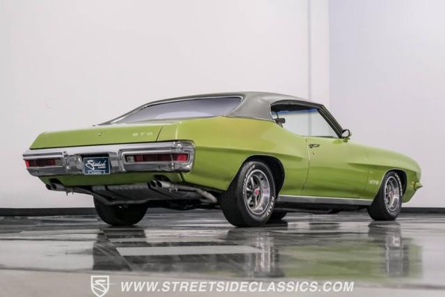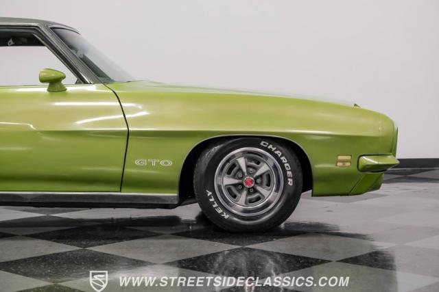 This 1971 Pontiac GTO sports the rare Tropical Lime Metallic paint, a color exclusive to this model year. The muscular lines of this classic coupe are accentuated by a contrasting black vinyl top, creating a bold visual impact. Riding on 15-inch stock wheels wrapped in 235/60R15 Kelly tires, this GTO maintains its original stance while offering modern road grip. Chrome bumpers and trim complement the vibrant green exterior, and tinted windows add a touch of mystery to this iconic muscle car.