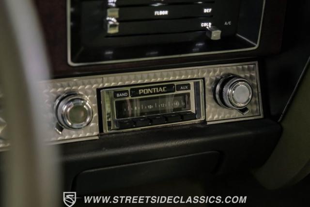 The interior showcases Jade vinyl bucket seats, a hallmark of GTO luxury. A four-speed manual shifter rises from the center console, offering direct control over the powertrain. The dashboard features an aftermarket stereo, blending modern sound capabilities with the vintage aesthetic. Air conditioning keeps occupants cool during spirited drives. The well-preserved headliner and dashboard underscore the care this GTO has received over the years. Aftermarket kick panel speakers enhance the audio experience without compromising the original interior design.