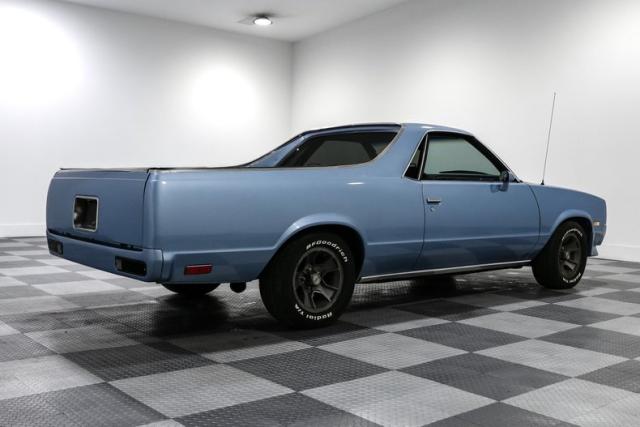 Inside, the blue cloth bench seat keeps things classic and comfortable. A column shifter, tachometer, air conditioning, and an aftermarket sound system round out the cabin, blending original charm with practical upgrades. This is a driver\'s El Camino that captures the spirit of a fading era, when muscle met utility and did it with style.