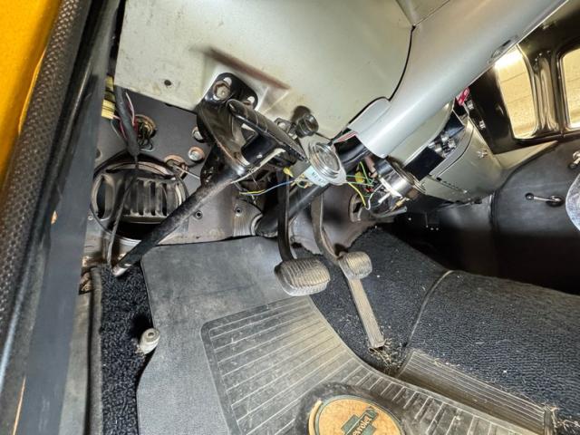 Keeping it simple on the inside, smooth black vinyl covers most of it, beginning with the door panels, flat and wrinkle free with no gaudy trim. The split bench in front and the full bench in back are basic black with no stitching or tufting and in nice condition save for a surface crack near where the upper and lower meet. A wooden three spoke sports wheel shares the column with a rather old school tachometer, just in front of the standard instrument cluster, clean, neat, and symmetrical and an AM radio is also embedded in the dash, all with a slight patina we don\'t mind at all! A floor mounted Hurst shifter rises from the depths of black loop carpet and the stitched black headliner is in good shape. The trunk is nicely painted and wears a fitted rubber mat.
