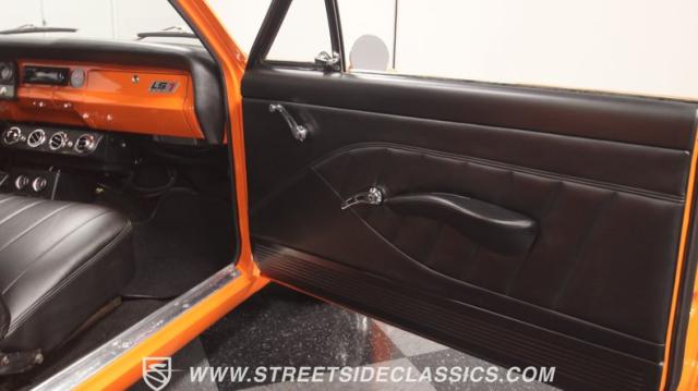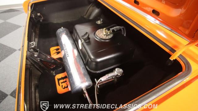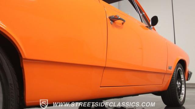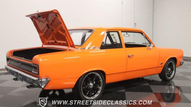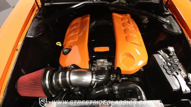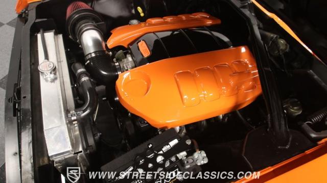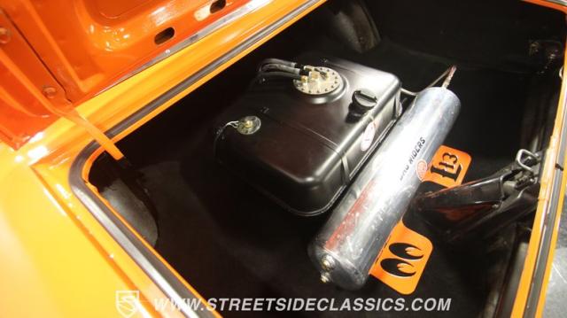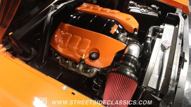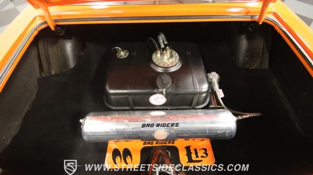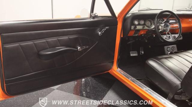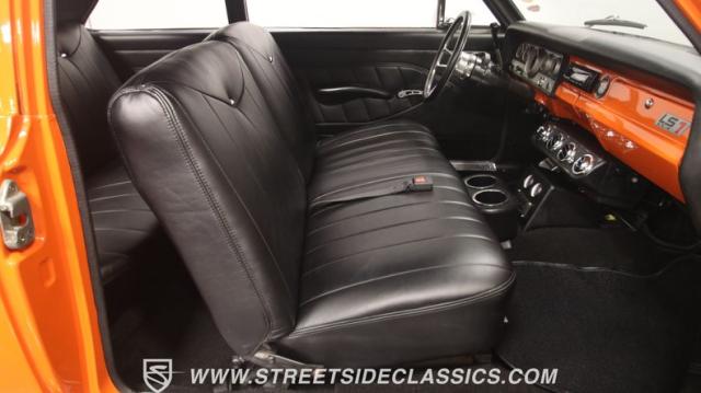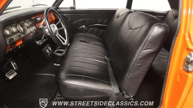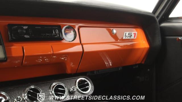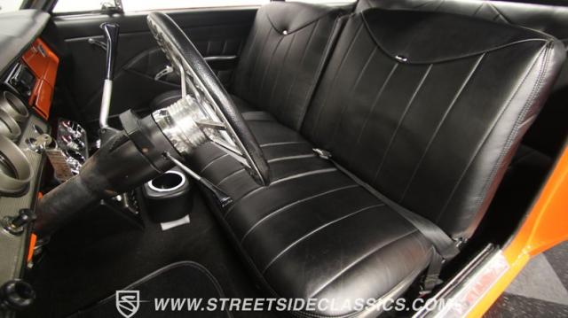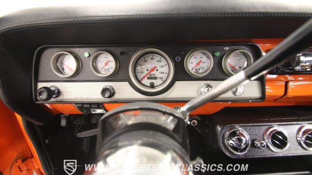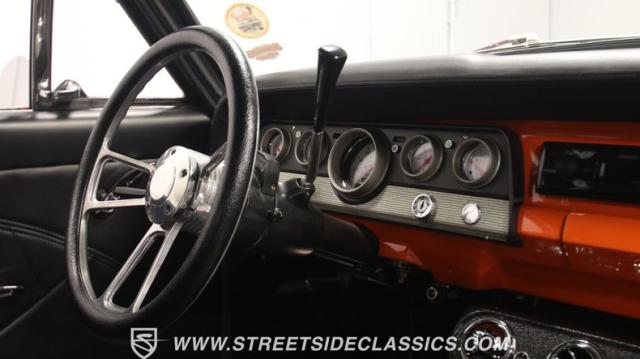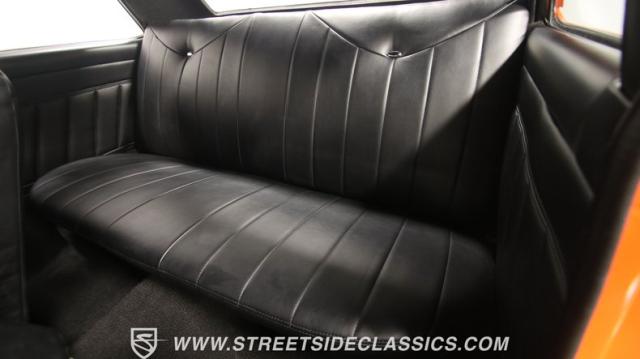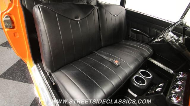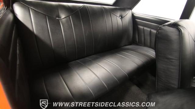 The interior is thoughtfully done where the color theme switches from the exterior to now give you plenty of black with just the right touches of bold orange. We love how the seats give you the classic split bench look but now it\'s deluxe custom upholstery done in supple leather. Plush carpeting, custom door panels, a smooth dash, and a custom foam headliner are all about making sure you remember a restomod means adding comfort. There\'s plenty of added luxury that also comes from upgrades like the cold-blowing air conditioning, cup holders, and an AM/FM stereo with USB and Bluetooth. There\'s even a custom consul with toggle switches for the air ride controls. Plus the sports steering wheel, billet pedals, and upgraded gauges signal that you\'ll love the driving experience.