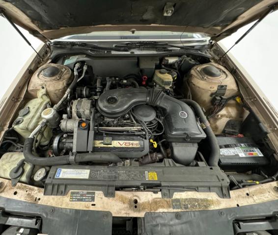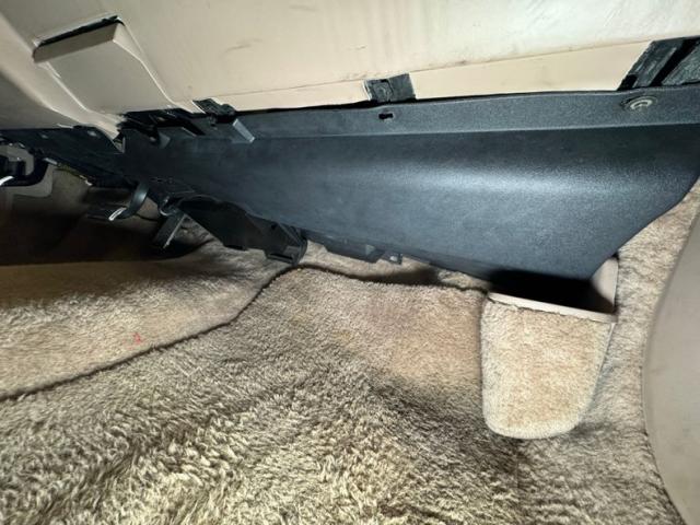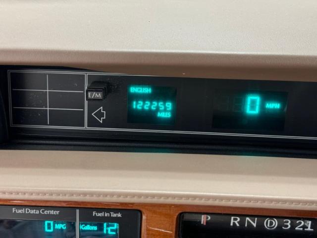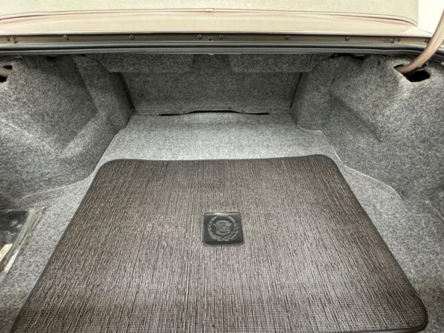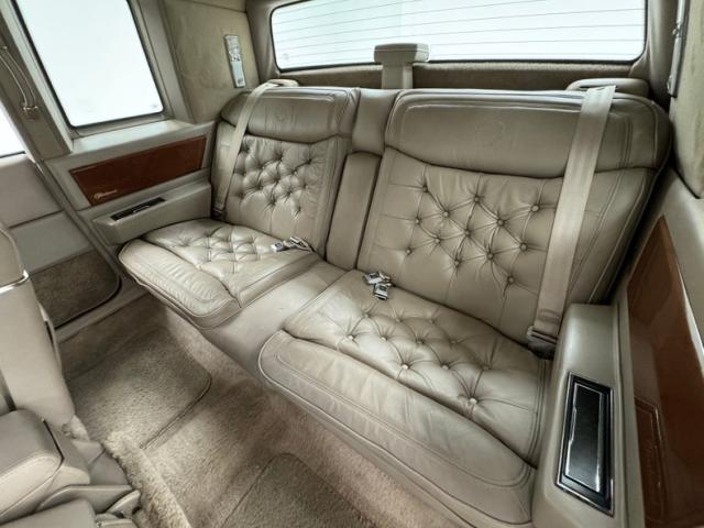 Simple, straight, and practical was the name of the game in this era and is exemplified by the boxy door panels in tan plastic and hardware surrounded by plastic woodgrain trim. We note a small tear and separation on the driver\'s side vinyl armrest where undoubtedly countless hours of hosting an elbow on relaxing drives occurred. Diamond tufted bucket seats in front wear Antelope leather, edge piping, and the Cadillac wreath embroidered into each seat back. The seats have held up well and look comfortable and this condition is mirrored in the rear seats which is configured for two but has seatbelts for three. The leather wrapped steering wheel holds an airbag and leads to the digital dash that displays in green digits common for the era. Everything is arranged horizontally, and the lower dash is adorned with more plastic woodgrain trim and houses an information center and A/C push button controls. In the center, the upscale Signature Series Delco radio remains and has AM/FM/Cassette and an EQ. We note some sagging of the vinyl on the glove box but the rest of the dash looks clean and intact. The plush beige carpet is in decent condition and has been protected by fitted Cadillac carpeted mats. GM\'s adhesive has given up the ghost and the headliner is sagging heavily and will need to be repaired or replaced.