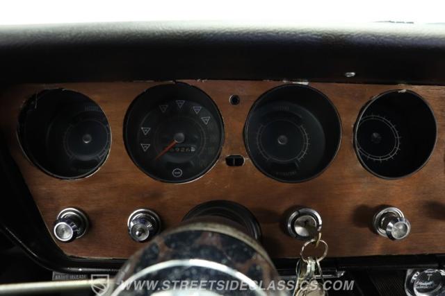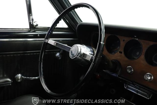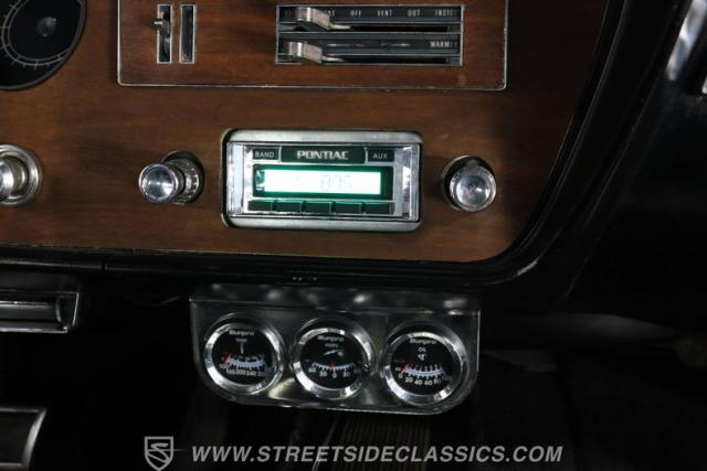 Black vinyl bucket seats anchor the performance-oriented interior. The factory console houses the shifter for the automatic transmission. A retro AM/FM radio provides audio, while the dash displays stock instrumentation. Under-dash mounted, chrome bezel SunPro gauges monitor the powerful engine\'s vital signs. Power steering allows for easy maneuvering, complementing the car\'s performance setup.