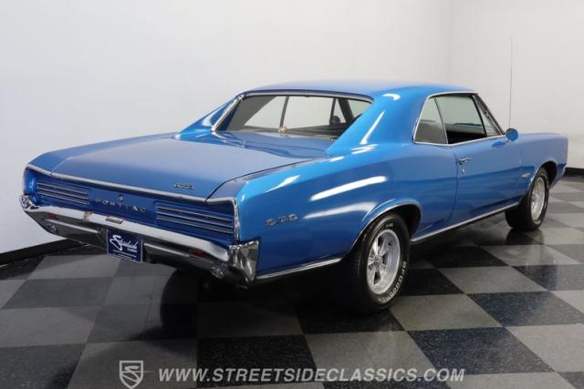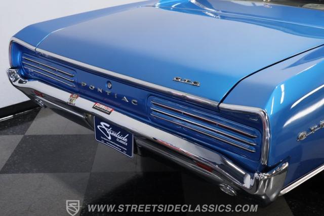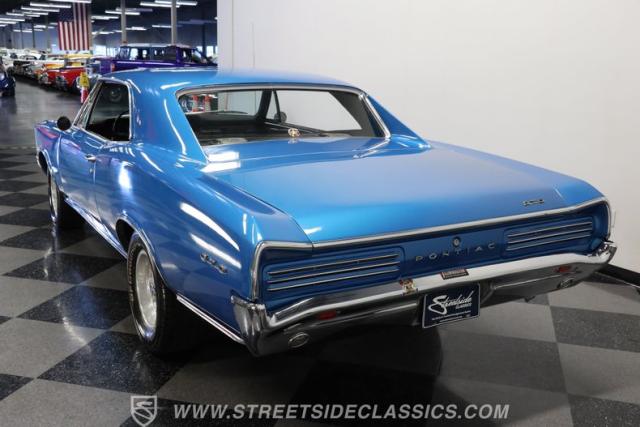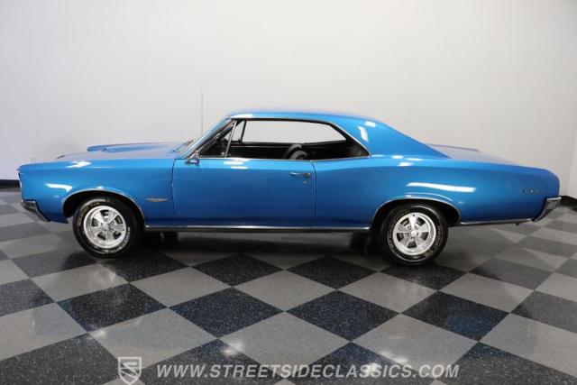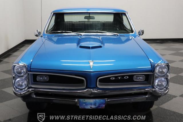 This 1966 Pontiac GTO showcases a Medium Blue Metallic exterior, accenting its muscular body. The iconic split grille and stacked headlights define its aggressive front end, while the hardtop profile emphasizes the GTO\'s sleek lines. Chrome bumpers add a touch of brilliance to both ends, and dual exhaust tips peek out from beneath the rear. Mounted on nostalgic 15-inch Cragar wheels and BF Goodrich Radial T/A tires staggered 235/60R15 front and 255/60R25 rear, this Pontiac exemplifies classic muscle car design.