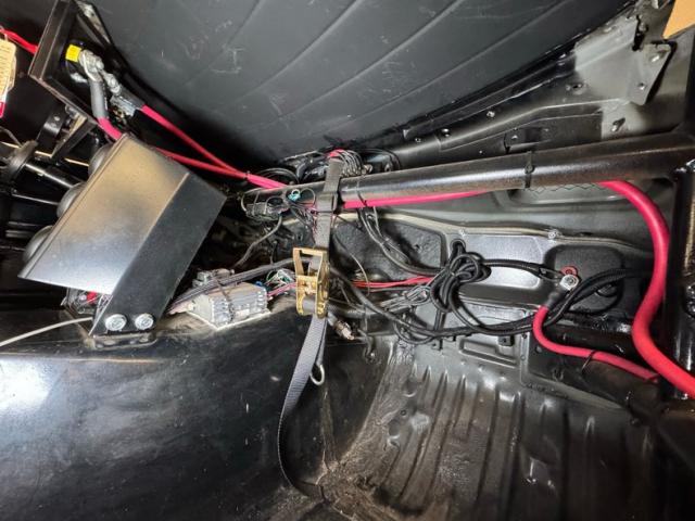 Remember, it\'s a race car so creature comforts and unnecessary weight has been removed, including the door panels, only the actuator and cross members remain. Racing seats keep occupants planted with the help of the roll cage mounted harness system while the small steering wheel fronts an AiM digital dash display accompanied by a series of system gauges backlit in various colors to the right. Some of the custom wiring can be seen as there are no cosmetic panels nor carpet on the floor. A stout shifter rises from the center console and OMP racing pedals work in conjunction to motivate this black beauty around the track.