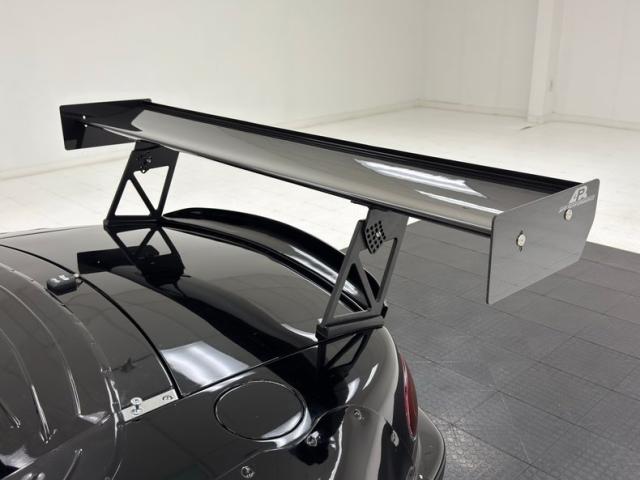 Menacing Black paint is matched by its wide, low stance and black 15-inch 949 racing wheels. If Batman drove a Miata, this would be it. Air ducts and heat extractors have been added on the exterior and the wide body kit was built by EP Miata for Pikes Peak. Front canards and the massive rear wing are carbon fiber while a custom windscreen and rear deck covers guide the quick air over the car. A JPM built custom roll cage integrates with the driver\'s roll bars and Miata\'s diminutive door handles remain and present the only non black feature other than the door numbers and class designation. Imperfections include a crack in the fiberglass and some scuffs on the bumpers.