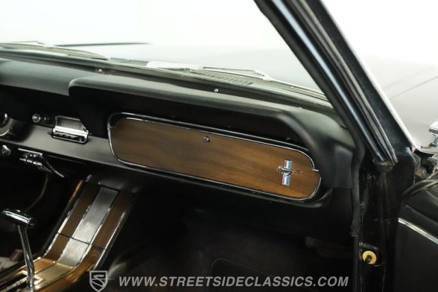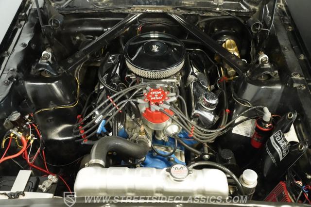 Inside, we find a cool black on black vinyl interior, accented with woodgrain trim. A center console separates a pair of bucket seats. A three-spoke power-assisted wood-rimmed showcases a Mustang center cap, positioned just ahead of a five-pod gauge cluster featuring a large, center-mounted 140 mph speedometer. Sliding HVAC controls keep things easy, while an AM radio offers entertainment options, in case, for some reason, you ever get tired of listening to the rumble of the exhaust.