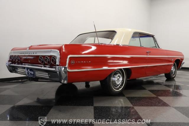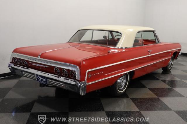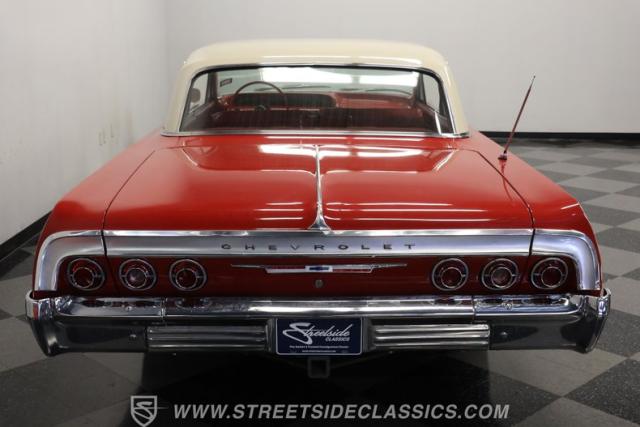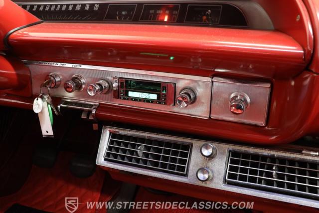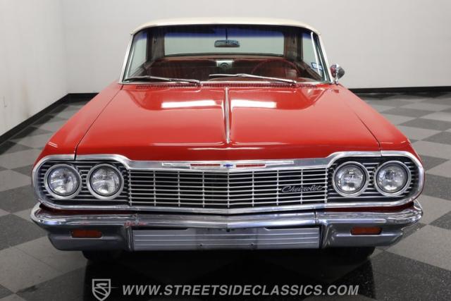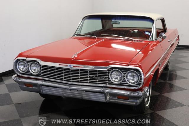 Now here\'s a true member of boulevard royalty. This 1964 Chevrolet Impala is not only one seriously iconic cruiser, but it\'s also ready for action just as soon as you bring it home. It\'s decked out in red paint with a deep shine, and a brief session at the hands of a skilled detailer will take this vintage Chevy\'s curb appeal to an even higher level. Take a lap around and you\'ll notice the precise fitment of its body panels, leaving it with clean lines and doors, hood and trunk that open smoothly and shut with a reassuring thud. Its bumpers, both fore and aft, are level as a table and show no concerning blemishes, and its headlights are as clear and as translucent as you could want. This is a very appealing classic.