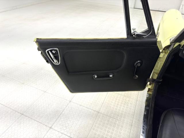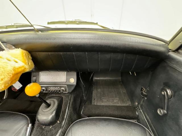 Clever door panels place the actuator towards the back of the door allowing passengers to reach over their shoulder to open the door and requires less hardware in the door to reach the latch. The black vinyl panels are in great shape and have a hinged front quarter window above. Black vinyl also covers the bucket seats with patterned inserts and added headrests. The rear deck is carpeted and houses a couple of speakers and the crossmembers of the roll bar. Straight ahead a banjo style steering wheel greets the driver and is emblazoned with the Austin-Healey crest in the middle, a combination of the Lord Austin family crest and the Austin or \"noble\" Coat of Arms. A 4 gauge pod is presented to the driver with the ever important tachometer and speedometer, the larger of the four. An original BMC AM radio is in the center just behind the floor mounted shifter and its yellow #1 billiard ball shift knob. Low pile black carpet completes the interior tour and we would categorize the interior as one that shows the cars has been driven and enjoyed and is entirely presentable.