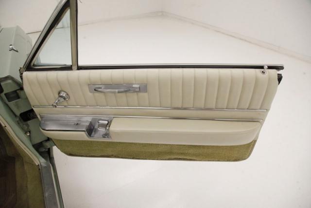 Near perfect faux leather pattern Sandalwood vinyl is interplaying with chrome trimming, smooth vinyl and vertically stitched vinyl wrapping around the door panels. A padded Sandalwood armrest runs the full gamut of the center on the doors holding the toggles for the power windows and mirror joystick, and green carpeting covers the lowers. Inside we are met with a sprawling split bench front seat in more clean Sandalwood vinyl. Smooth bolsters with white piping separate them from the wide section tuck and roll inserts. A rear bench is in back in the same pattern with a central chrome dressed speaker and looks nearly unused. In front of the driver and the original steering wheel is a symmetrical dash with a central Buick tri-shield badge, and dark greenish brown for the padded dash top and Sandalwood for the metal painted dash front. A few brushed and ribbed aluminum panels are also here housing the pulls and knobs. The original AM/FM radio resides here as well as the heat/defrost slides just above that appear to have been also used in fighter jets of the era. Like new dark green carpeting floods the floors and compliments the Sandalwood vinyl splendidly.