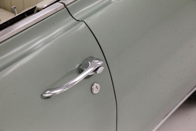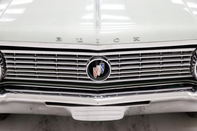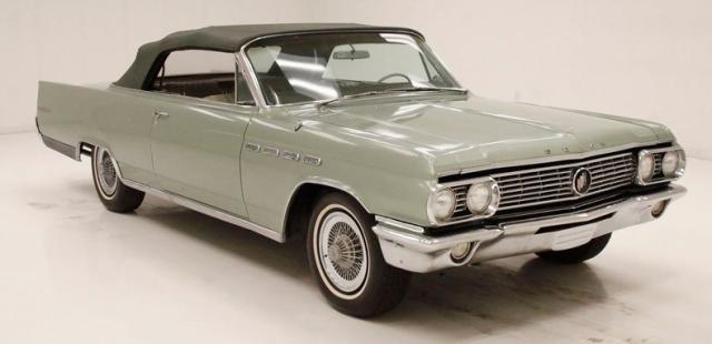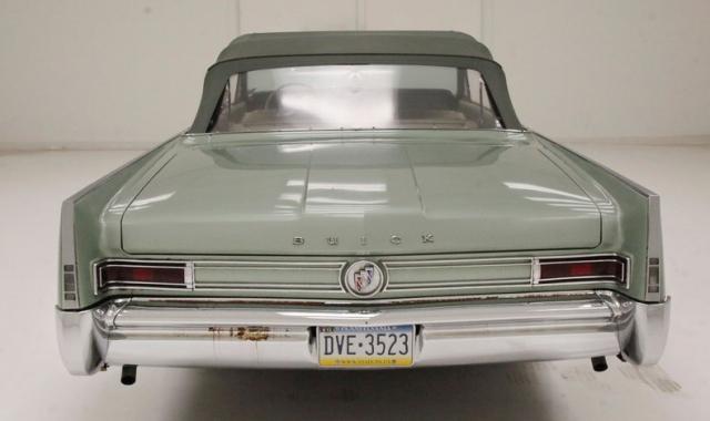 Straight steel all bathed in a respray of the original Willow Green paint which presents very nicely. Overall, the paint is well applied with only minor inclusions and cracking of the finish but we do note some color difference on a few of the panels, particularly the driver\'s door along with some surface rust on the sides. Dramatic crisply peaked fenders and quarter panels are dominant features on this body, strikingly unique among the GM brands, but aiding owners with regards to outermost body locations while driving. Atop the rear quarter panel fins we see a bright stainless trim spear which flows rearward and ends just above the rear bumper and encircles the reverse lights. This thin trim spear also runs forward down the sides at the mid beltline and wraps around the clean and clear glass. Chrome for the bumpers shows some tarnishing and has some patina and rusting on the rear bumpers. Just above in the front is the grille, which is made up of horizontal chrome bar and is flanked by dual headlights on either side. More chrome trim highlights the ample windshield glass and passenger compartment. A tight dark green convertible top is on with no tearing and only minor staining. This top is power actuated and has a plastic rear window which has a light fogging to it. 15-inch turbine style chrome wire wheel covers with Buick badged center hubs are wrapped with thin whitewall 235/75R15\'s on all 4 corners.