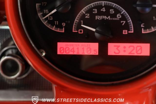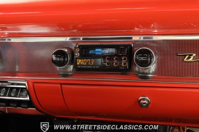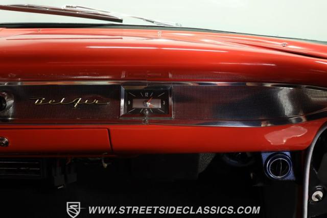 Inside, we find a beautiful two-tone red and silver/grey interior featuring a split-bench seat and a classic dual-rim, power-assisted steering wheel that sits before a hybrid digital/analog aftermarket red-backlit gauge cluster. Stock-looking sliding HVAC controls offer air conditioning, while the Bel Air badging and passenger-side analog clock help maintain the classic vibe of this droptop.