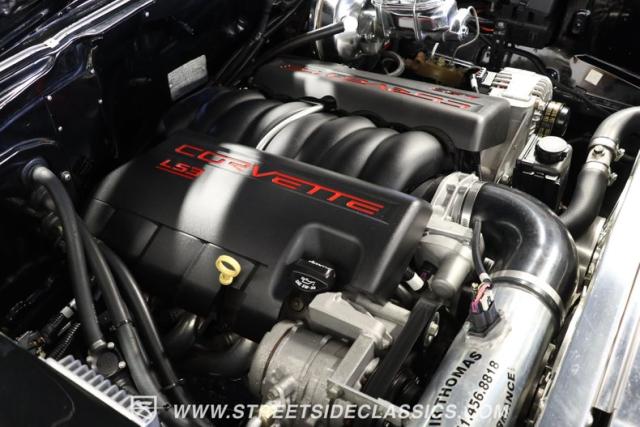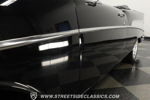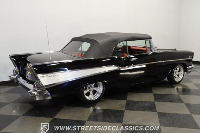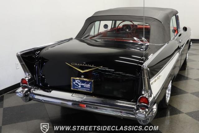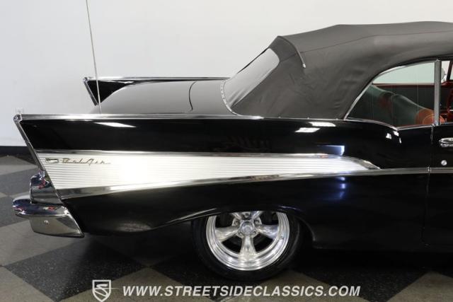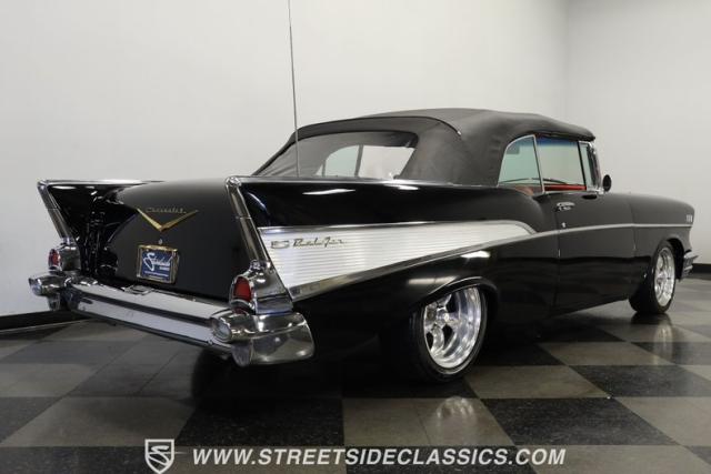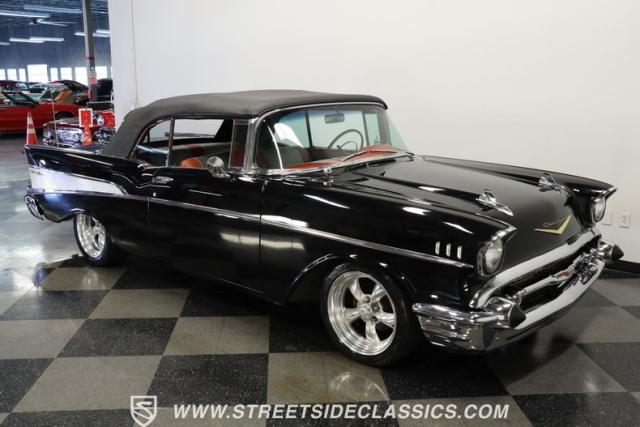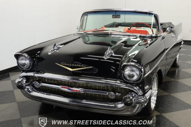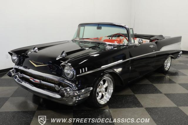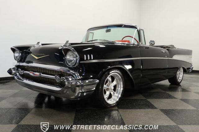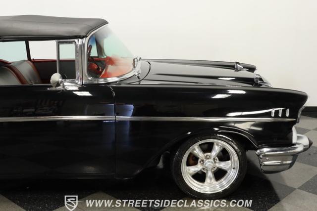 When it comes to collectible classics, it\'s hard to beat a Tri-Five Chevy. But, with so many of them roaming the highways and byways of America, it can be hard to stand out from the car show crowd. That won\'t be a problem if you take one look at this 1957 Chevrolet Bel Air Convertible LS3 Restomod. Fully repainted in a beautiful brilliant black exterior finish and matching sleek power-operated black canvas top, this drop-top has a slammed-to-the-ground stance that shows off its massive 17-inch polished American Racing Torq Thrust II five-spoke wheels shod in Michelin rubber to give this cruiser much more than just another retro revival vibe.