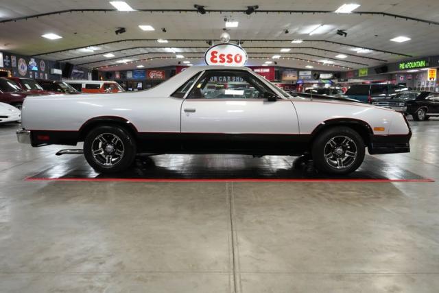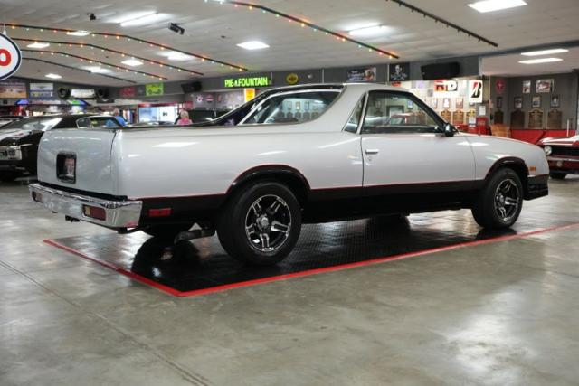 This 1986 Chevrolet El Camino blends street performance and show-quality style with a Blueprint 400 Small Block Chevy V8 paired to a TCI 700-R4 automatic transmission and a 3.73 POSI rear end. Featuring air conditioning, power steering, and power brakes, it\'s as comfortable as it is capable. The red and black leather interior complements the silver and black two-tone exterior with red pinstriping, while 15\" Ultra Motorsports Drifter wheels and electric cutouts give it an aggressive stance and sound. Enhanced with MSD ignition, Holley 4-barrel carb, three electric fans, and projector halo headlights, this El Camino is built to turn heads.