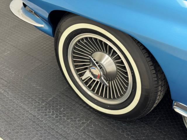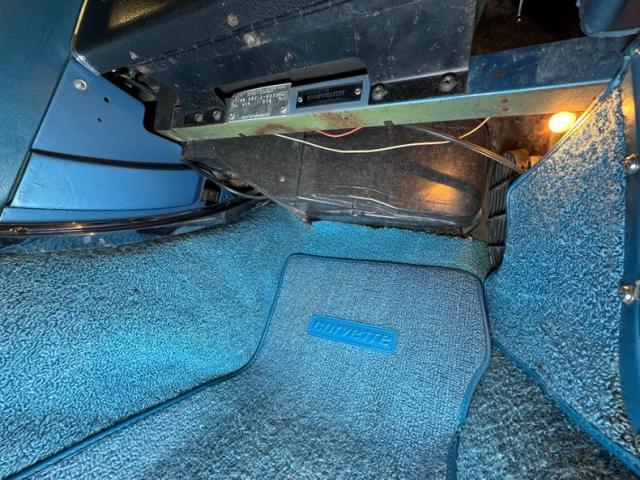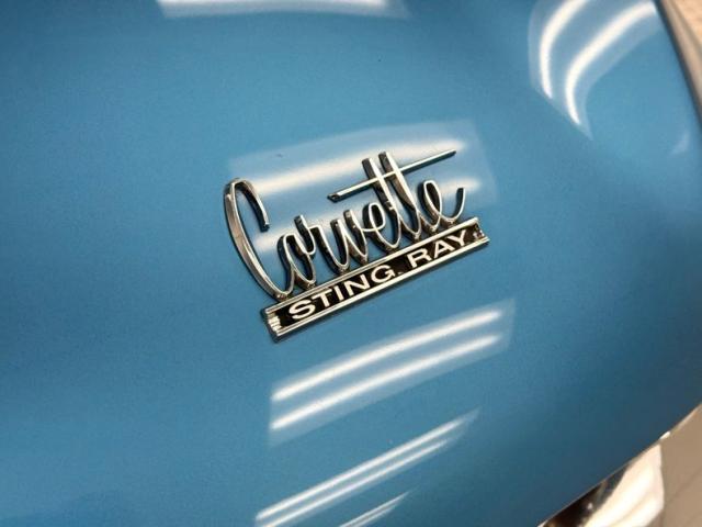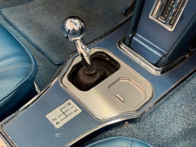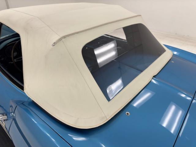Nassau of course is the capital city of the Bahamas and the water color is accurately depicted on this car. The Bahamas are home to 40 species of sharks and so it\'s fitting that this Sting Ray has a shark-like shape. A nose that\'s pointed, a hump that adds height like a dorsal fin and reappears on the trunk lid, vertical side gills, and a tail that tapers to a point, streamlining the air just like a shark\'s tail slipstreams through water. In profile, the vented heat shield of the side pipes vies for some attention and gets it, flanked by 15-inch wheels with knock-off hubs and white wall tires. Overhead, the white canvas soft top is in great shape, showing some typical blemishing but fully intact with clear plastic rear window. Metalwork that includes window frames, door handles, mirror, gas cap, light rings, and emblems are all in immaculate condition. Imperfections in the paint include some unevenness at the rocker panel, a scratch on the edge of a character line and another one touched up just above it. There\'s also a slight gap issue on a corner of the hood, but most onlookers won\'t notice.