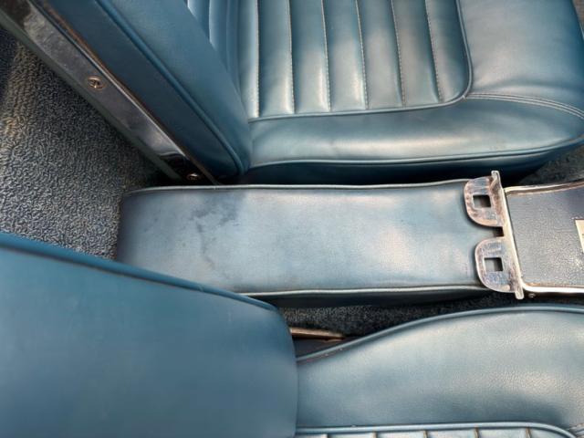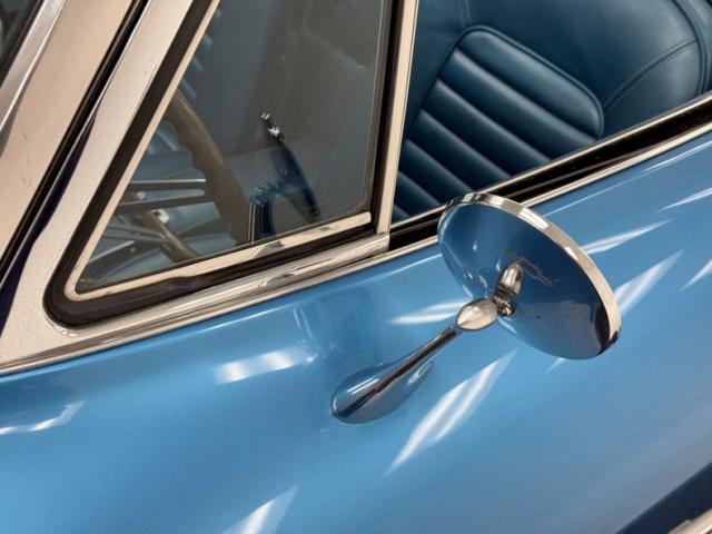 Blue coverage continues on the inside where Bright Blue door panels wear brushed nickel hardware and beyond the metal sills we find bucket seats in blue vinyl, taut and clean with rib patterned inserts. The walnut 3 spoke steering wheel leads to the infamous coved gauge pod with symmetrical circles, two large units flanked by two small ones on each side. The plastic and gauge faces show slight patina but are in great condition, as is the center stack in Nassau blue and housing a rather elaborate analog clock and the vertically mounted radio. The double hump dash repeats in front of the passenger with only the arched door of the glove box in front. A clean center console sports a few love chips and is home to a standard chrome shifter with reverse finger hooks that transform the shifter into a set of brass knuckles when it\'s time to back up. Blue loop carpet fills the foot wells, covers the back cargo area and shows some slight discoloration and a stain in back, but is fully intact.