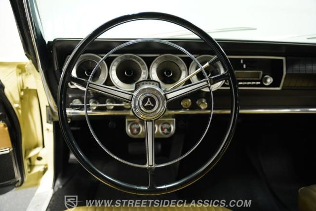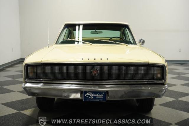 The silhouette of This 1967 Dodge Charger, cloaked in the radiant hue of Cream, carries with it a legacy not just of speed, but of spectacle. With its sleek fastback lines and 14-inch Magnum 500 style wheels hugged by P215/75R14 tires, it casts an imposing figure, a testament to its revered status in muscle car lore. This Charger transcends mere automotive appeal; it\'s a piece of history rolling on asphalt. The hideaway headlights lend an air of mystique, solidifying its place as a vehicle of both performance and cinematic pedigree.