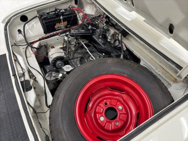 With this very nice example, (one of the BEST I\'ve seen here at my tenure at Classic Auto Mall and that\'s saying something as I\'m the 4th longest running employee!), anyway I digress, and within the pristine white painted engine bay is the 145ci horizontally opposed 6-cylinder which was recently rebuilt. It is fed by dual 1-barrel EFI units and has a 2-speed Powerglide tranny on back. The rear axle is a 3.89 Posi type. Just a beautifully restored/preserved engine bay and a pristine spare is residing there as well.