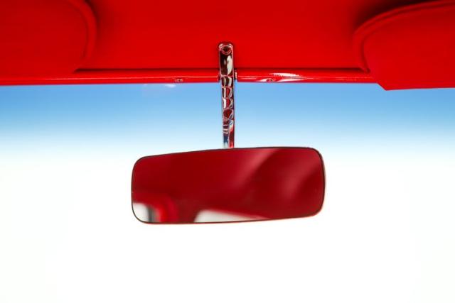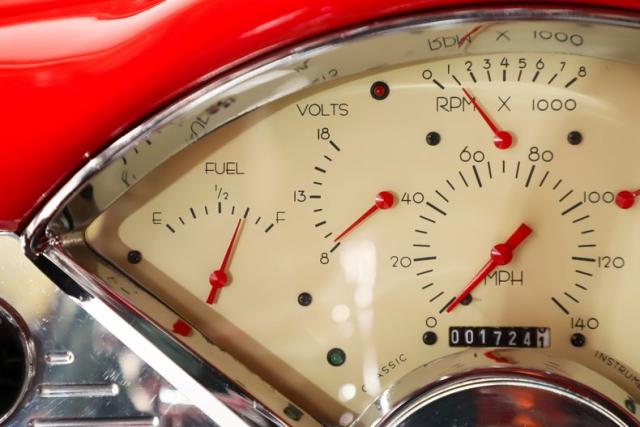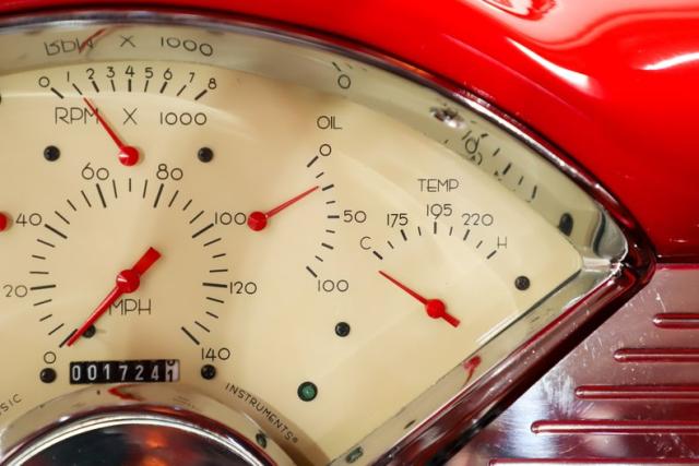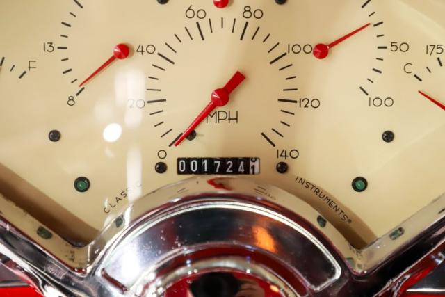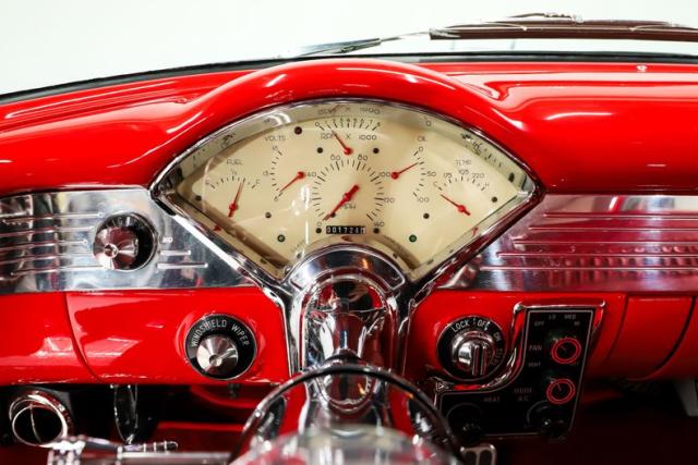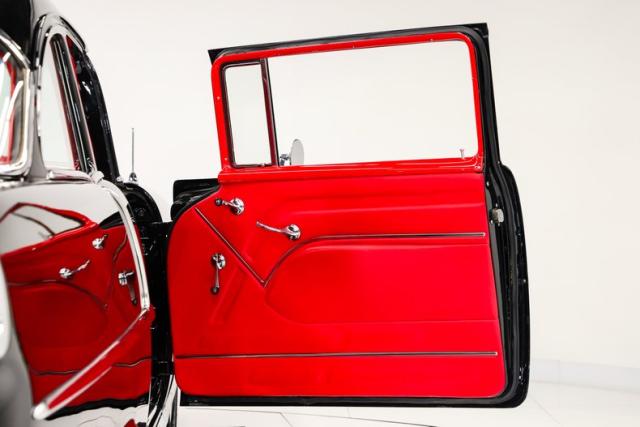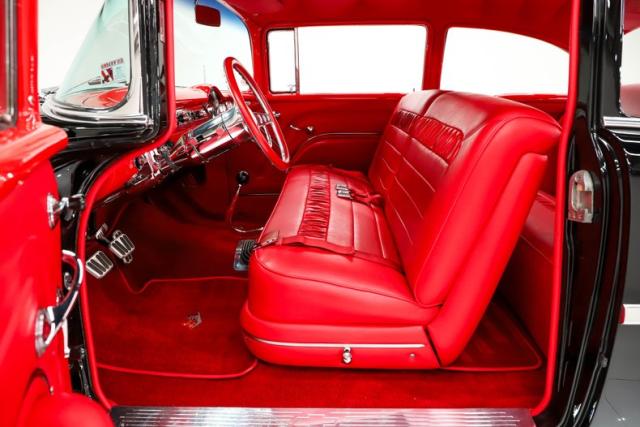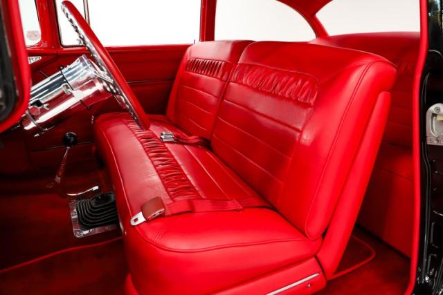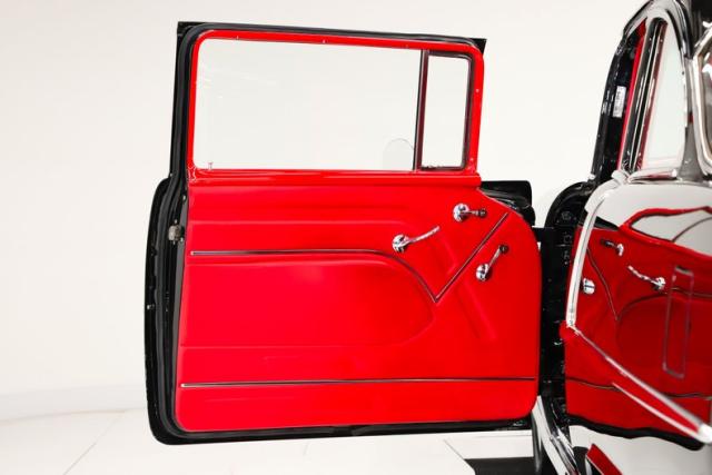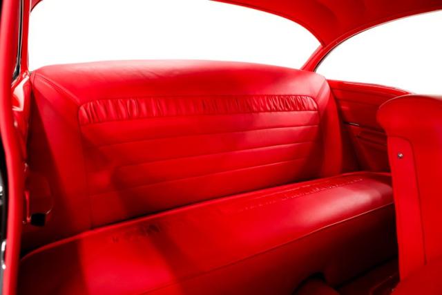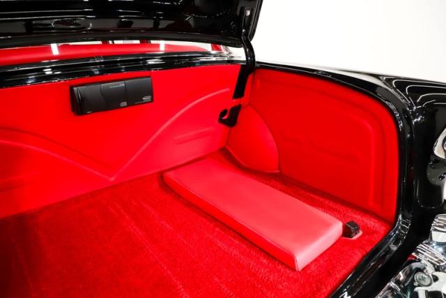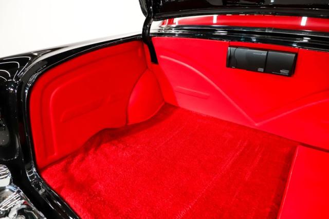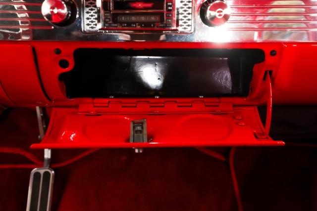 INTERIOR: The interior is just as impressive as the exterior-the contrasting red is absolutely stunning. It\'s clearly a professional restoration with excellent fit and finish throughout. Down on the floor is fresh red carpet, matching mats and a 5-speed shifter! The door panels are custom, yet retain a classic look and feature new window cranks, handles, and armrests. The seats have been recushioned and beautifully reupholstered. The metal trim is painted gloss red, complemented by polished billet accents across the dash. It\'s been upgraded with a full set of modern gauges, a retro stereo, heat and A/C controls, and a tilt column with a Billet Specialties steering wheel. Overhead, a new red headliner and matching visors complete the look. Behind the scenes, it\'s been updated with a new wiring harness and modern push-in fuse panel.
