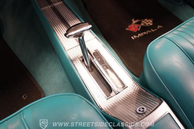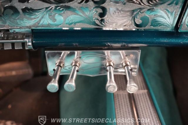 Finished in teal green metallic paint with custom flake and mystic-style striping, this Impala commands attention from every angle. Chrome accents, gold engraving details, rear window louvers, and dual antennas complete the look, giving it the unmistakable presence only a true lowrider can deliver. This is a statement car-built to be seen, respected, and enjoyed.