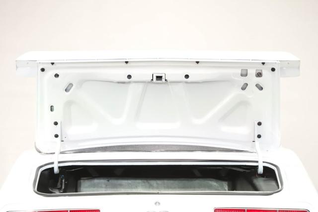 EXTERIOR: The body is straight as a rifle and fits right. It has a tall metal and cowl hood and spoilers. The bright white paint is polished like glass! It is dressed up with correct dimension black hockey stick stripes. The vinyl top looks like new. The glass was replaced. All the chrome and trim is straight and shiny too. It has the exterior trim package. The lowered stance sits perfectly on the highly polished 18 inch Torque Thrust wheels wrapped in performance tires.