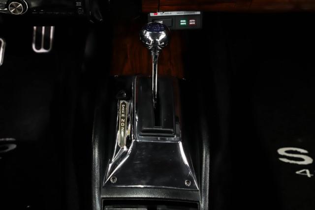 INTERIOR: The first thing you notice is the custom handmade 2 tone upholstery done in genuine leather. The sport seats are firm and supportive. The door panels, armrests, handles and window cranks are reproduction. Down on the floor is fresh carpet and embroidered SS 427 mats. Up above the headliner, visors and mirror have been replaced. In front of me is a new dash pad, the glove box area is mint. Right in front of me is a completely custom instrument panel with Sport Comp gauges and a polished billet instrument bezel. It also has a chrome tilt column with a Grant sport wheel. The factory center console has been retrofitted with a B&M slapstick shifter. There is a JVC stereo with kick panel speakers and 6x9s in back.